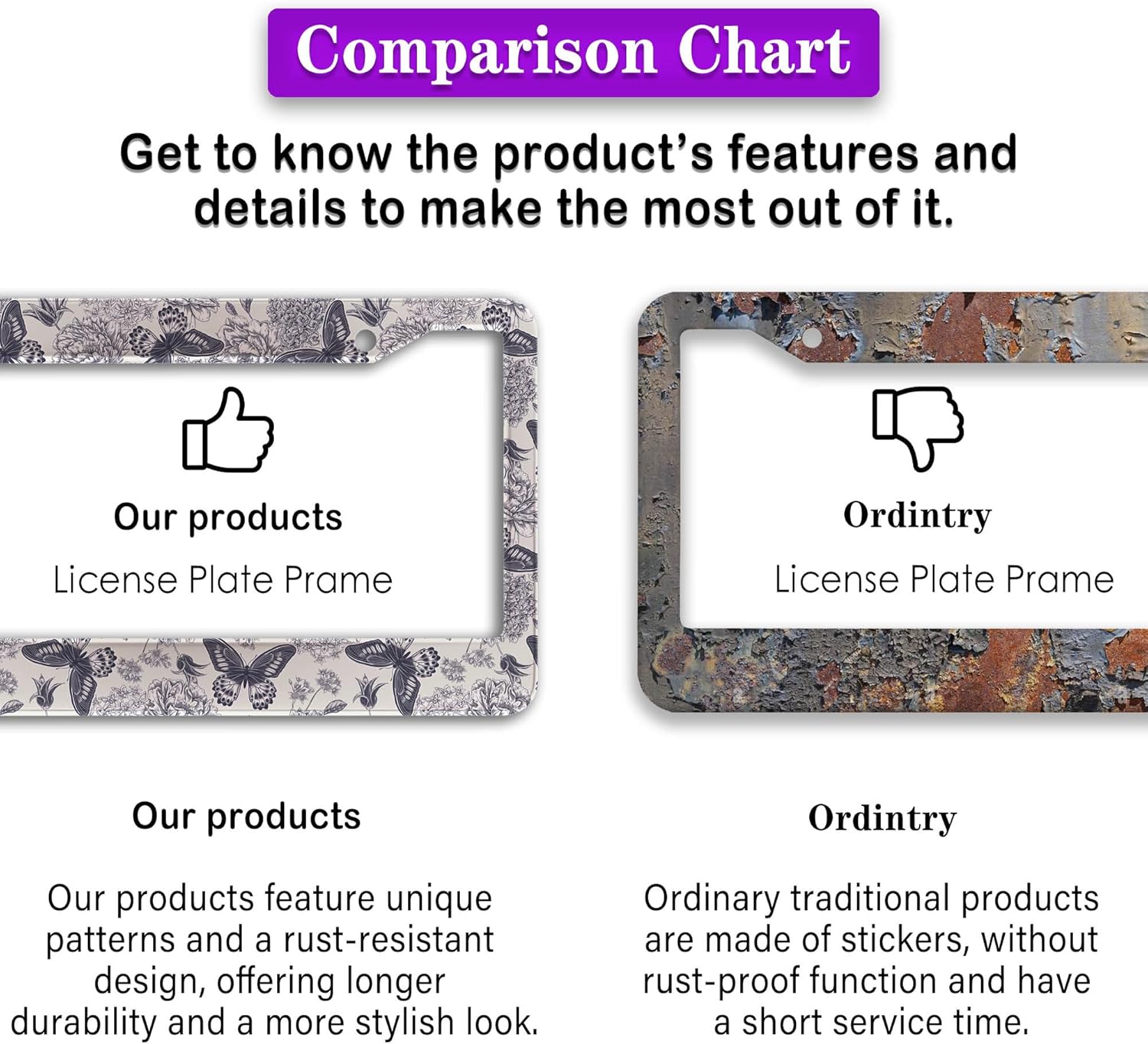 - ALUMINUM FRAME: This License Plate Frame is crafted from high-quality aluminum that is resistant to corrosion, rust, and harsh weather conditions. Its rugged reliability design ensures a long lifespan, making it capable of withstanding car washes and extreme weather, providing you with a reliable and stylish solution for your vehicle.