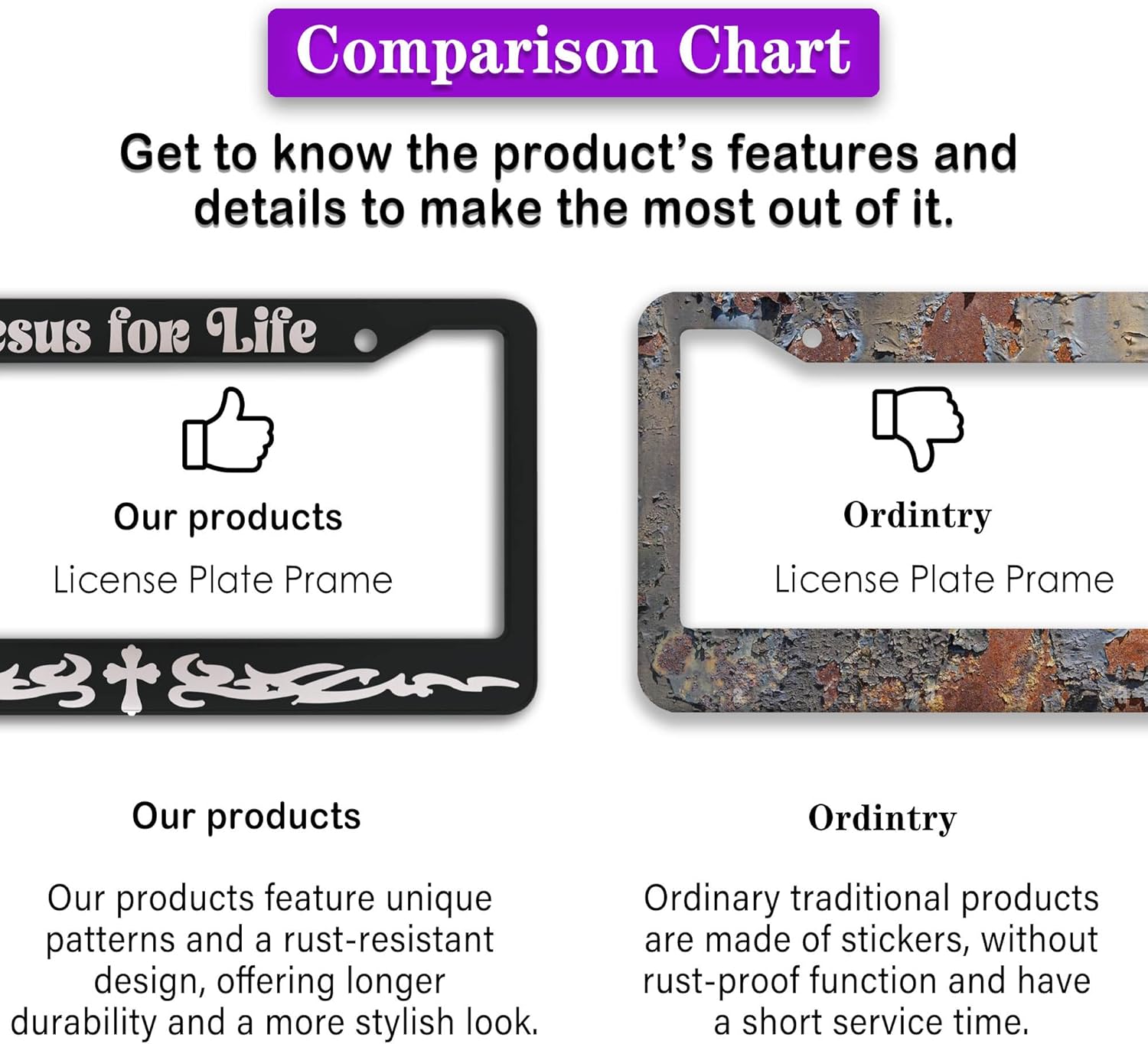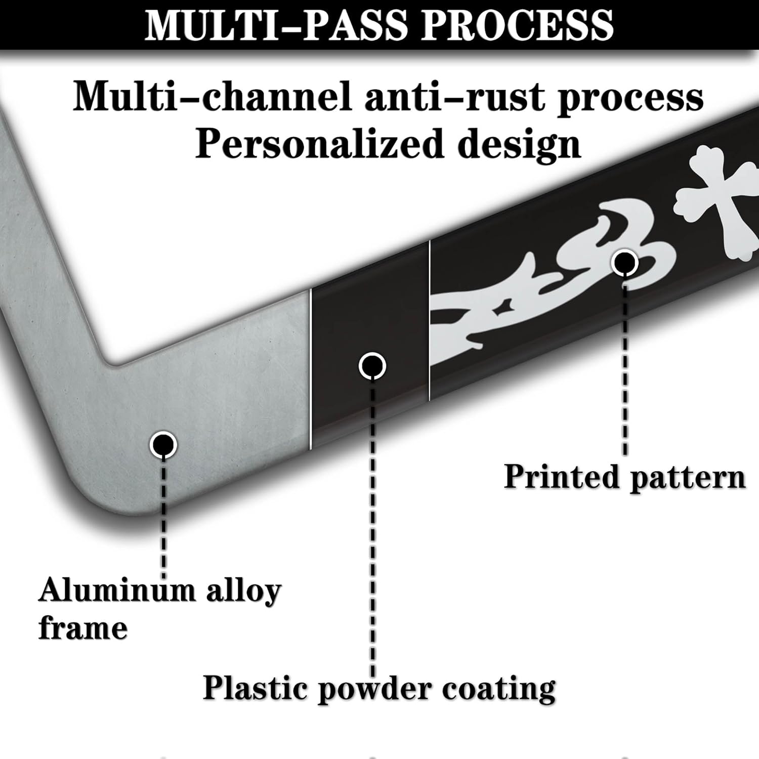 - ALUMINUM FRAME: This License Plate Frame is crafted from high-quality aluminum that is resistant to corrosion, rust, and harsh weather conditions. Its rugged reliability design ensures a long lifespan, making it capable of withstanding car washes and extreme weather, providing you with a reliable and stylish solution for your vehicle.