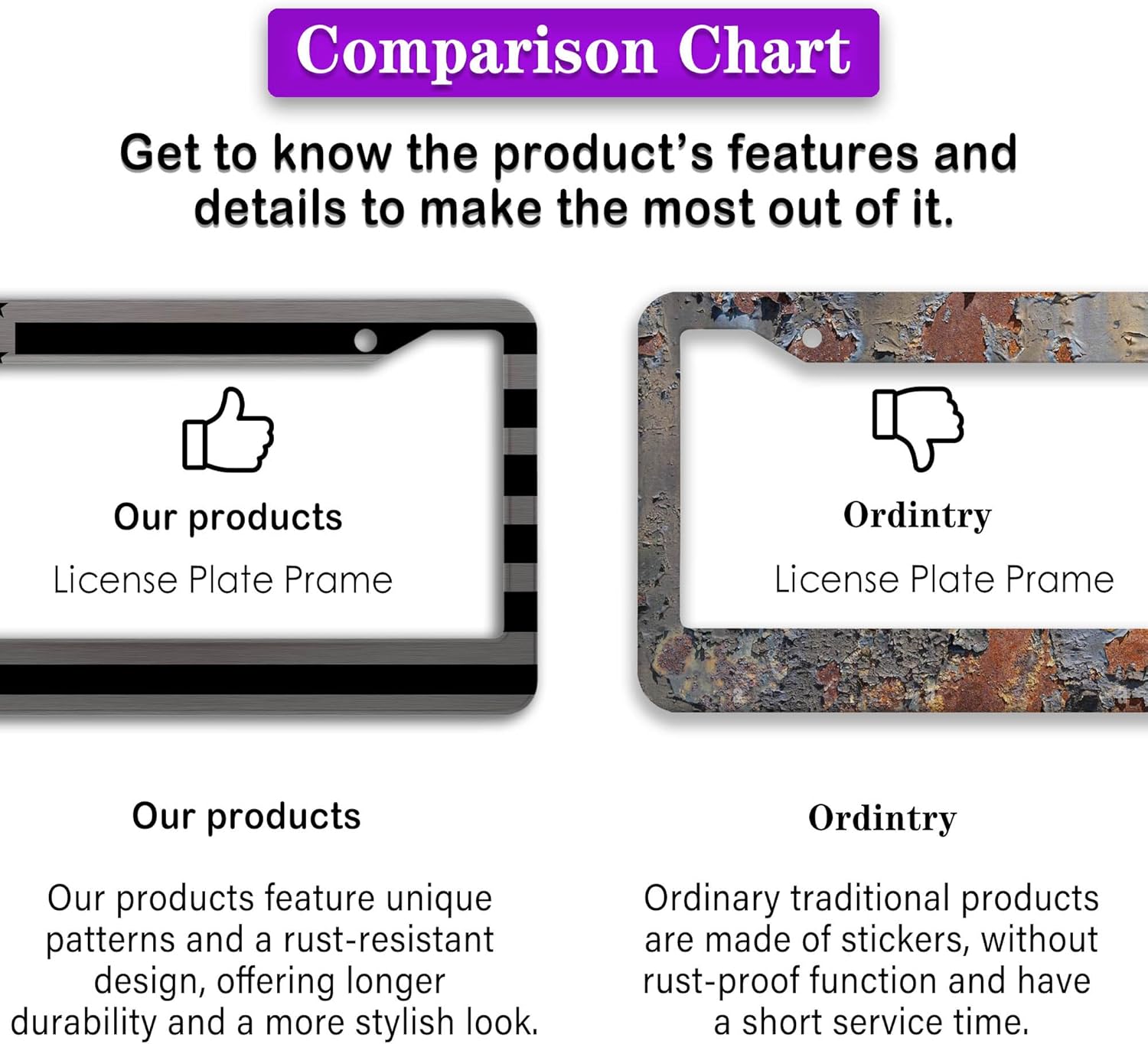 - ALUMINUM FRAME: This License Plate Frame is crafted from high-quality aluminum that is resistant to corrosion, rust, and harsh weather conditions. Its rugged reliability design ensures a long lifespan, making it capable of withstanding car washes and extreme weather, providing you with a reliable and stylish solution for your vehicle.