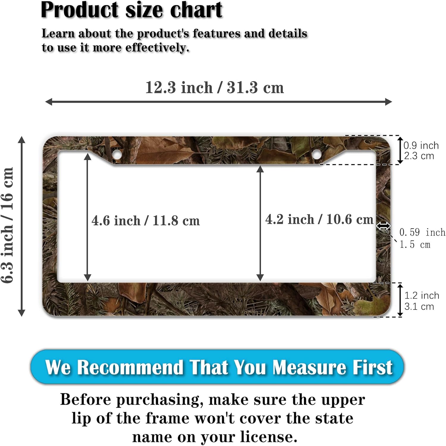 - STANDARD FRAME SIZE: Ensure a perfect fit by checking the dimensions to avoid covering your state name. These frames are specifically designed to fit standard American license plates measuring approximately 12.3" x 6.3" (16 x 31 cm). for most license plates in the U.S.