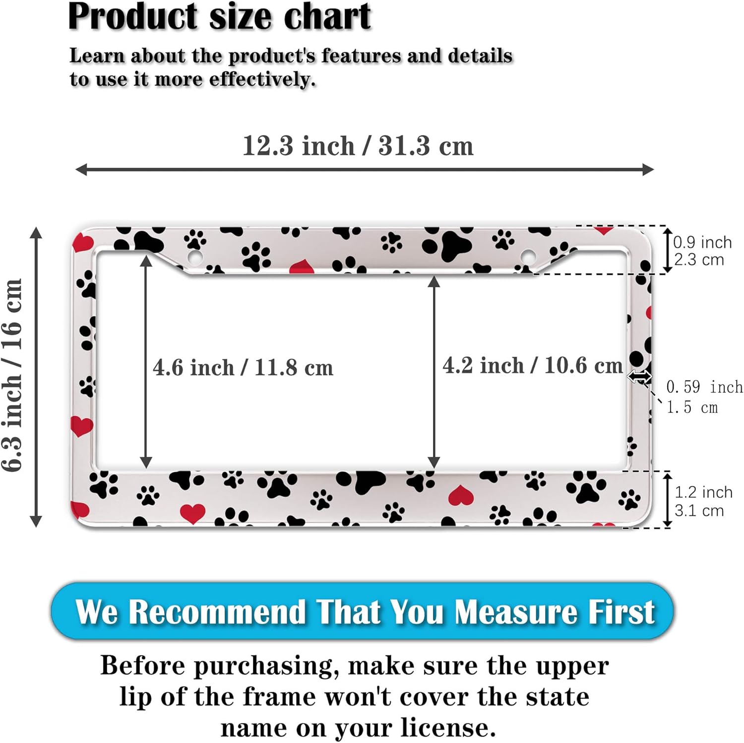 - STANDARD FRAME SIZE: Ensure a perfect fit by checking the dimensions to avoid covering your state name. These frames are specifically designed to fit standard American license plates measuring approximately 12.3" x 6.3" (16 x 31 cm). for most license plates in the U.S.