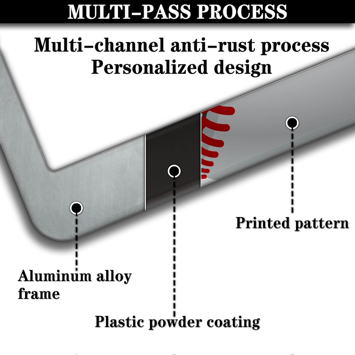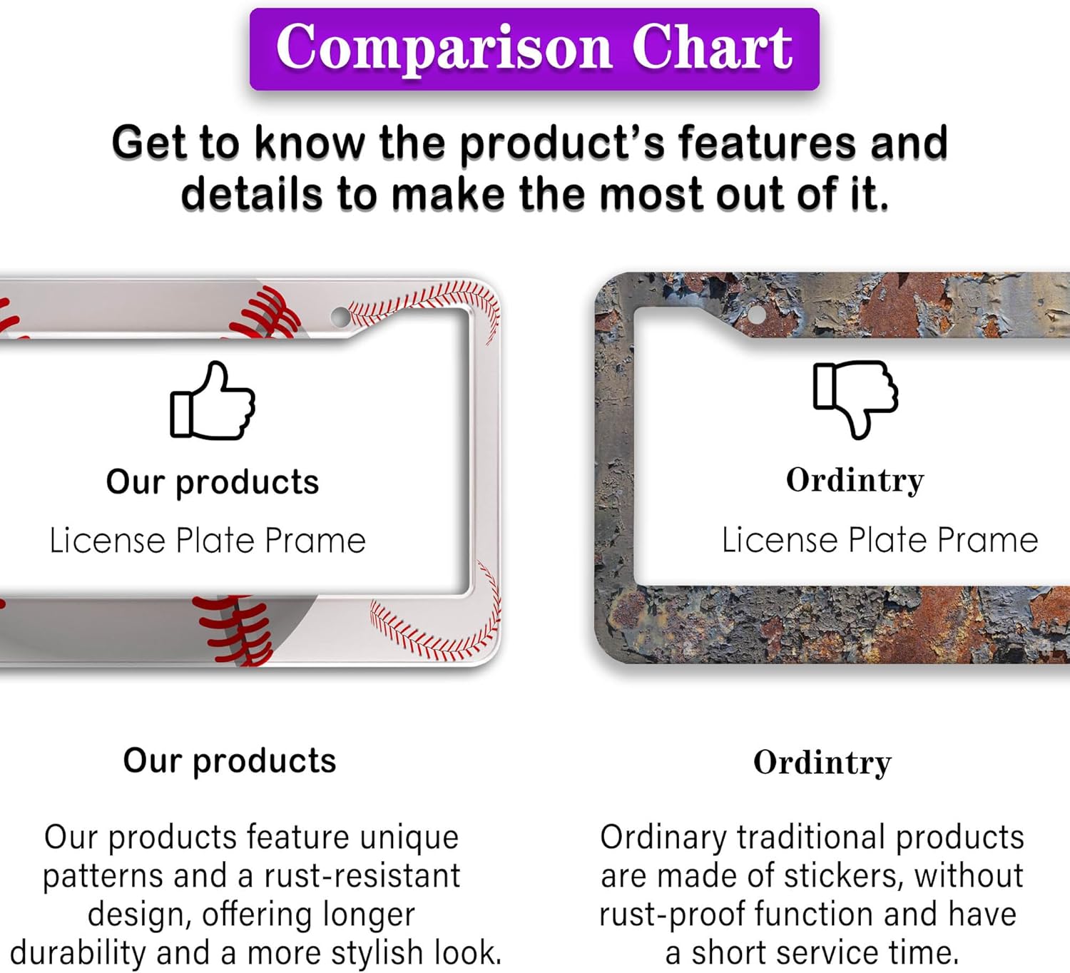 - ALUMINUM FRAME: This License Plate Frame is crafted from high-quality aluminum that is resistant to corrosion, rust, and harsh weather conditions. Its rugged reliability design ensures a long lifespan, making it capable of withstanding car washes and extreme weather, providing you with a reliable and stylish solution for your vehicle.