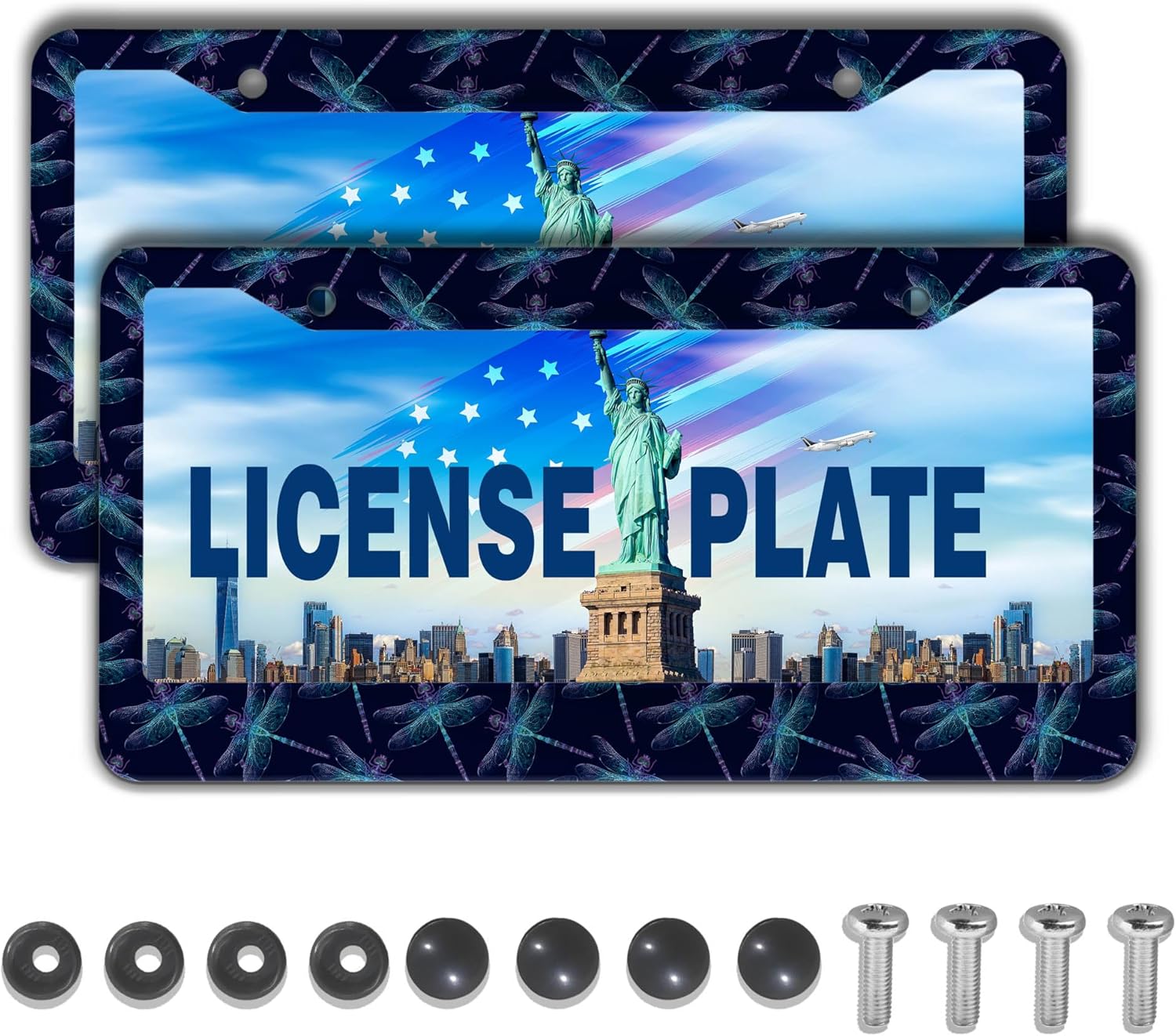 License Plate Frames Black Blue Automotive Exterior Accessories Beautiful Dragonfly Insects Aluminum Metal Car Accessory 2 Pack with Screw Covers Set