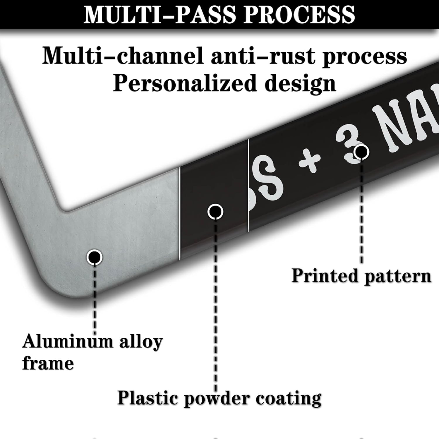 - ALUMINUM FRAME: This License Plate Frame is crafted from high-quality aluminum that is resistant to corrosion, rust, and harsh weather conditions. Its rugged reliability design ensures a long lifespan, making it capable of withstanding car washes and extreme weather, providing you with a reliable and stylish solution for your vehicle.