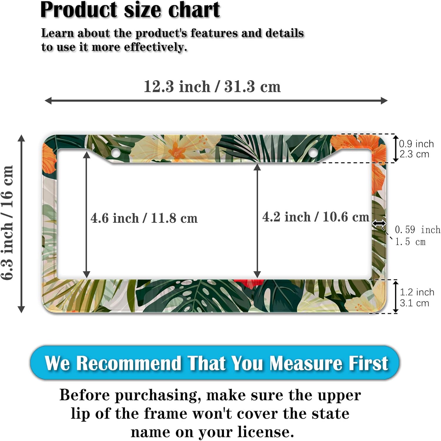 - STANDARD FRAME SIZE: Ensure a perfect fit by checking the dimensions to avoid covering your state name. These frames are specifically designed to fit standard American license plates measuring approximately 12.3" x 6.3" (16 x 31 cm). for most license plates in the U.S.