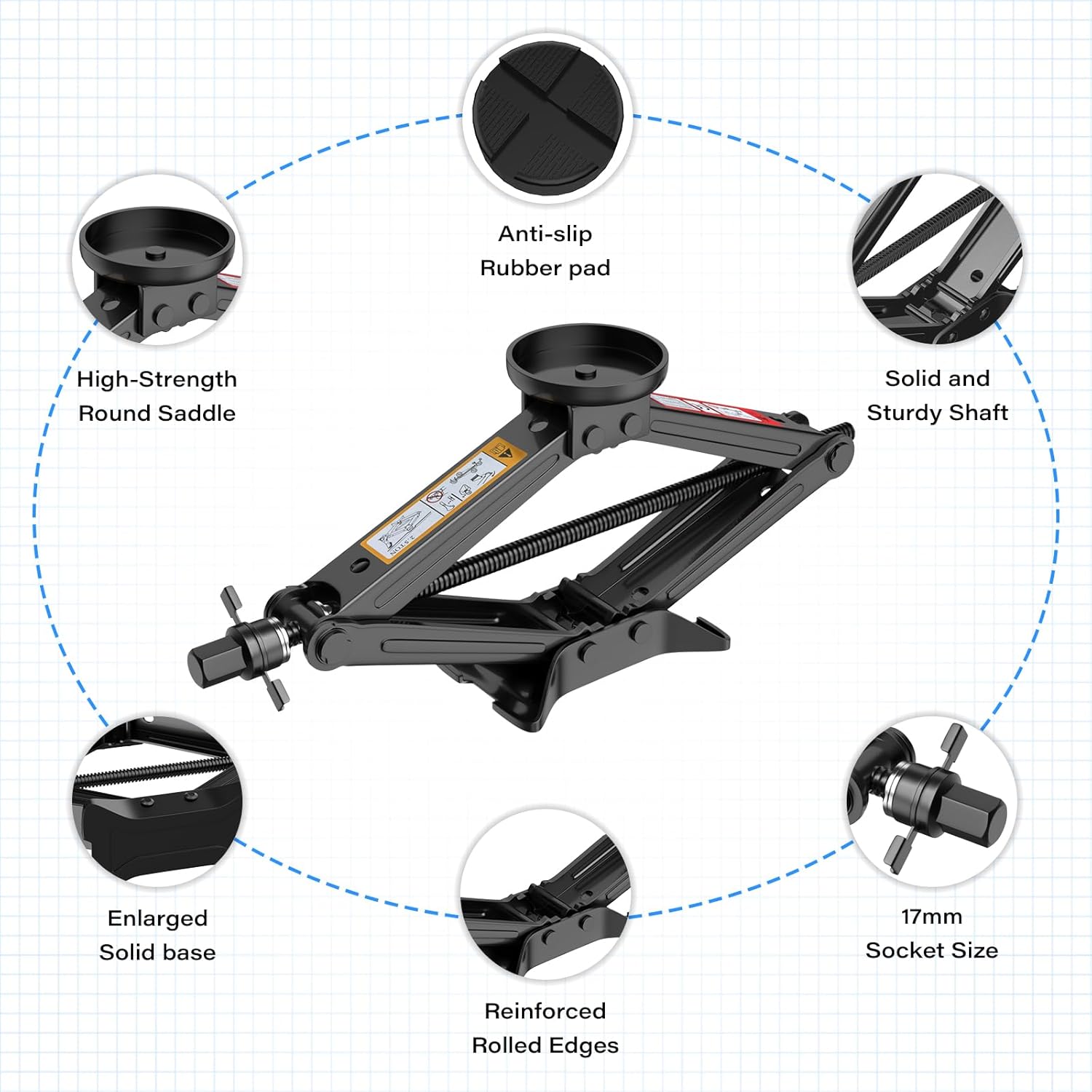 - 【Portable Car Emergency Kit】This Scissor jack universally compatible with Sedans, SUVs, MPVs, and other vehicles. It is perfect for emergency situations where you need to change a flat tire, remove a stuck wheel, or perform other vehicle repairs.Plus, its compact size makes it easy to store in your trunk or backseat.