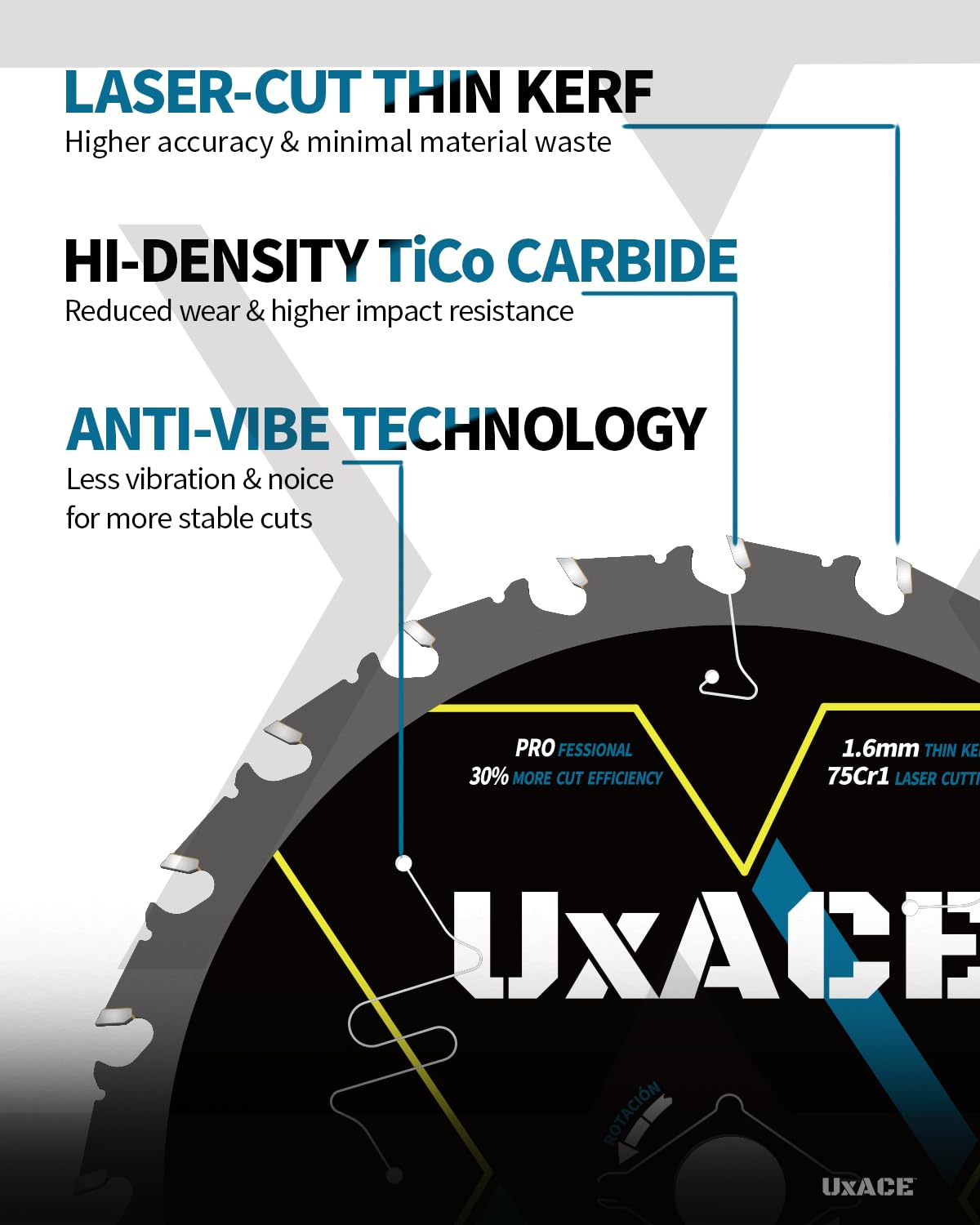 - 【WIDE RANGE OF APPLICATION】UXACE professional wood cutting circular saw blade delivers extraordinary performance and maximum lifespan. With thin kerf design, hi-density TiCo carbide and 75Cr1 hardened steel body manufactured, this is the blade suitable for anyone looking for smooth and clean cutting experience on softwood, hardwood, plywood, pressure treated wood, MDF, OSB, lumber and laminated using a corded or cordless circular saw