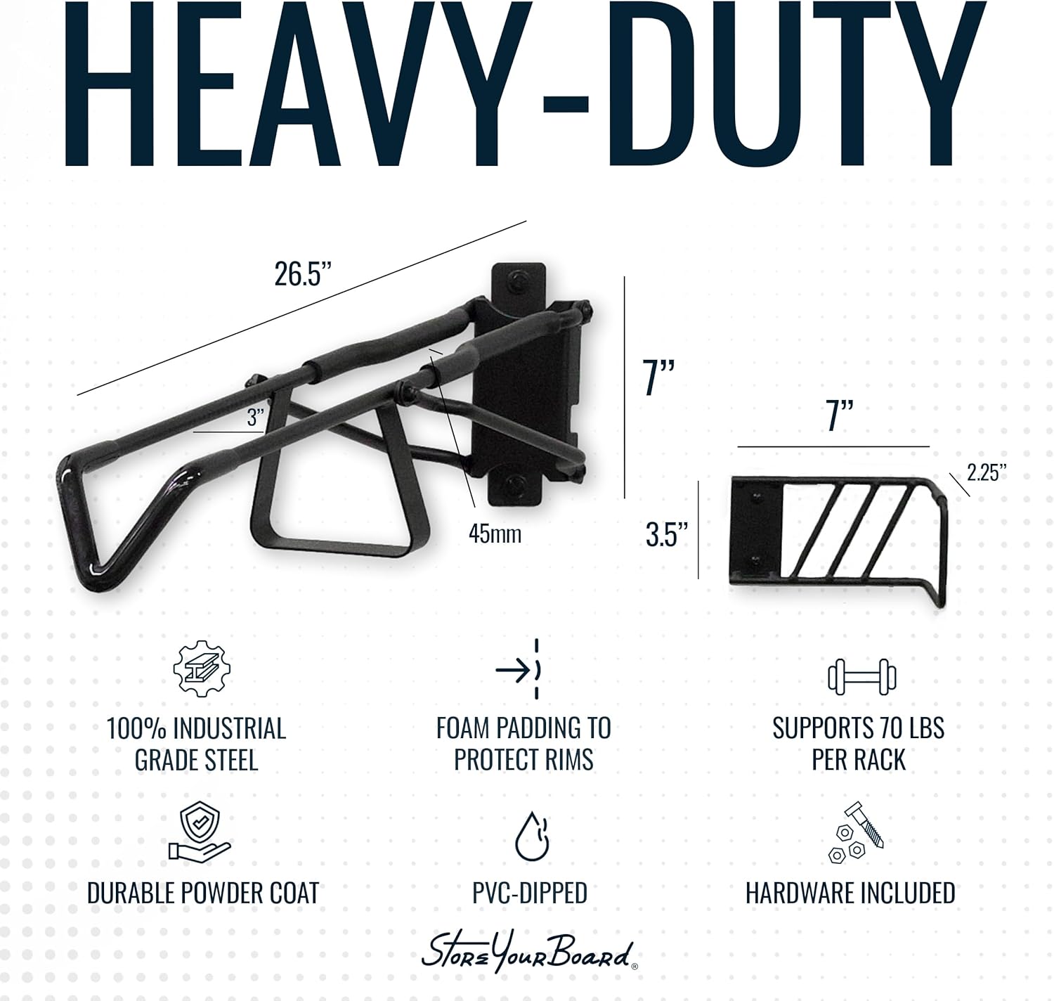 - 2-Pack Bike Rack Wall Mount: This garage bike rack wall mount stores road and gravel bikes flat against the wall. Fits bikes with tires 18–45 mm wide, including carbon frames and e-bikes. Perfect bike organizer for garage walls.