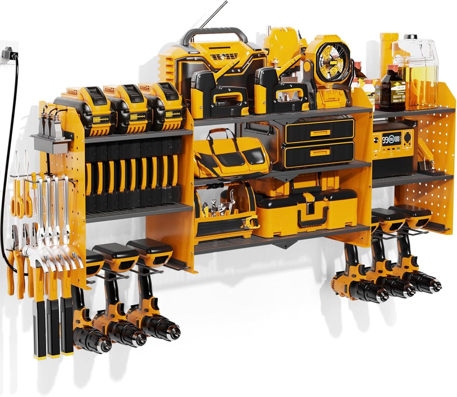 - Expanded Width to Maximized Storage: The Xankzi power tool organizer wall mount with charging station features a patented wide design in its 2 central shelves, perfect for storing more tools, especially longer items like chainsaws. Measuring 45.6" wide, 16.5" high, and 8.7" deep, this sturdy and space-efficient power tool storage rack keeps your tools organized