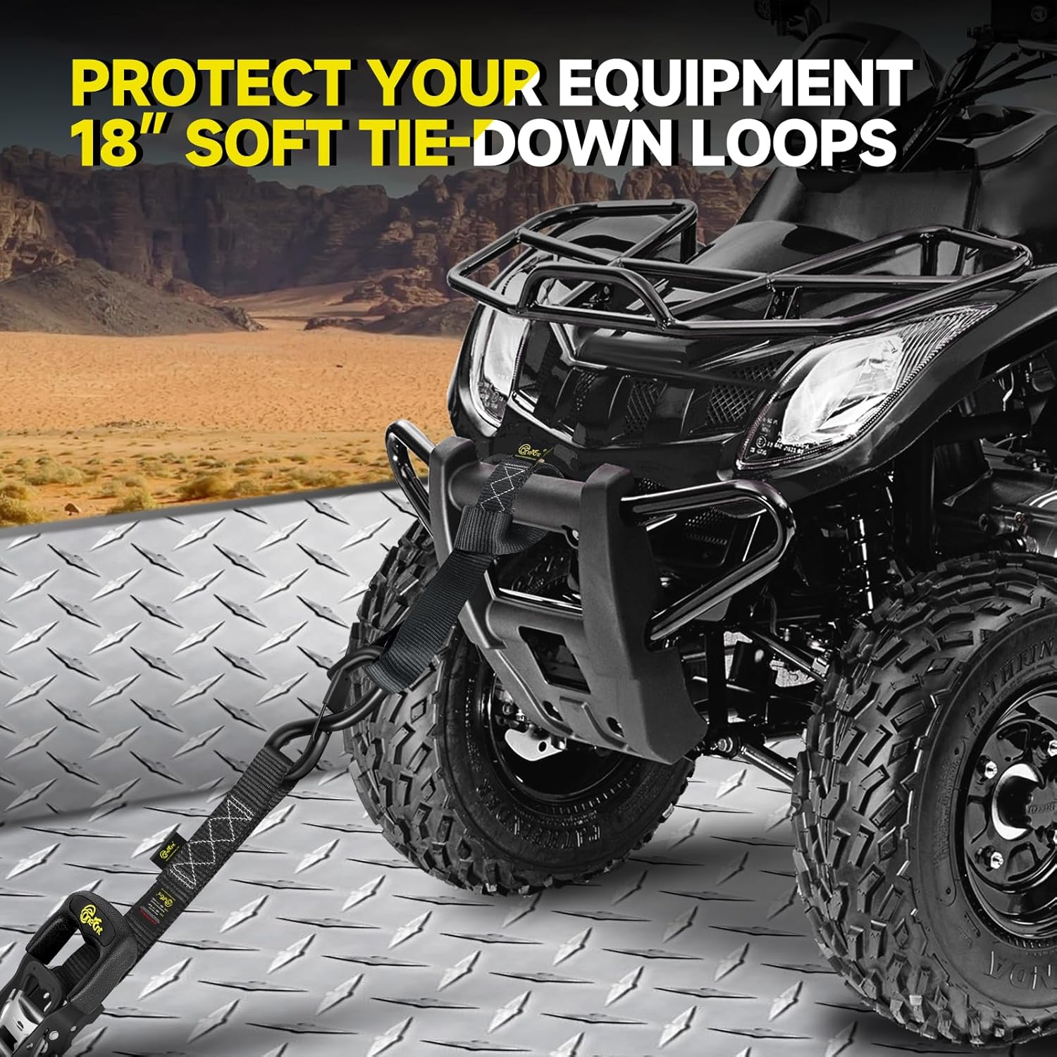 - Upgraded Ratchet Strap Kit : Our powerful tie-down strap kit includes (4) sturdy 1.6” x 16’ ratchet straps with padded handles, coated S-hooks with safety clips, and (4) 18” soft tie-down loops, all extended and thickened for ultimate reliability and ease of use.