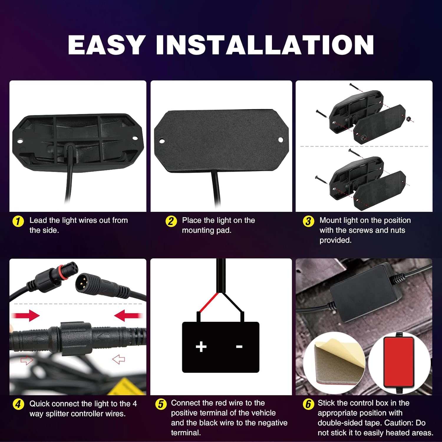 - Quality Materials & Waterproof: Using an aluminum base can effectively and quickly dissipate heat, no longer troubled by heat. Durable and sturdy PC lens is wear-resistant, scratch resistant, and not easily damaged. The combination of PC lens and aluminum base sealing makes the rock light achieve IP67 waterproof, which can also be used in harsh weather conditions