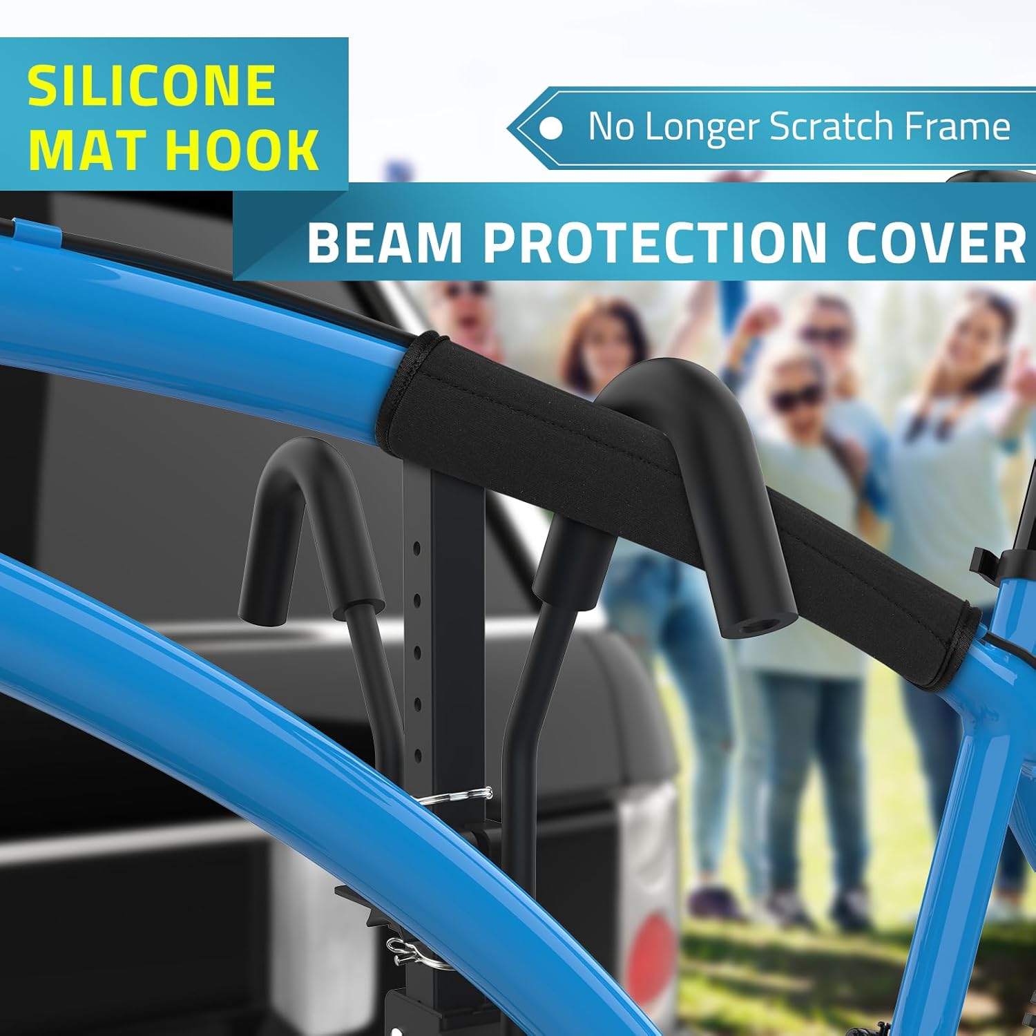 - ăANTI-SCRATCH & DROPăThis hitch bike rack provides more safety and stability without scratching your bicycle paint surface(Silicone Mat Hook + Beam Protection Cover double protection). J-hook slides easily over the perforated vertical frame to ensure a snug fit on bikes of various sizes,and the D-pin stops the hook from moving upward, ensuring your bike won't fall off the hook due to bumps in the road