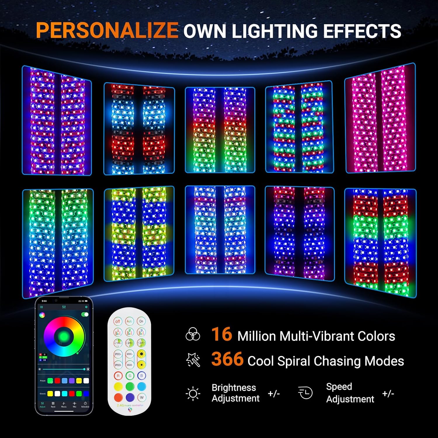 - ăDual Control and PersonalizeăFeaturing countless built-in colors and 366 customizable patterns, these whip lights can stream, strobe, cascade, chase, pulse, and more. They are controllable via an app or remote control, allowing users to personalize the light modes, adjust brightness, and set the movement speed to enrich your off-road trip