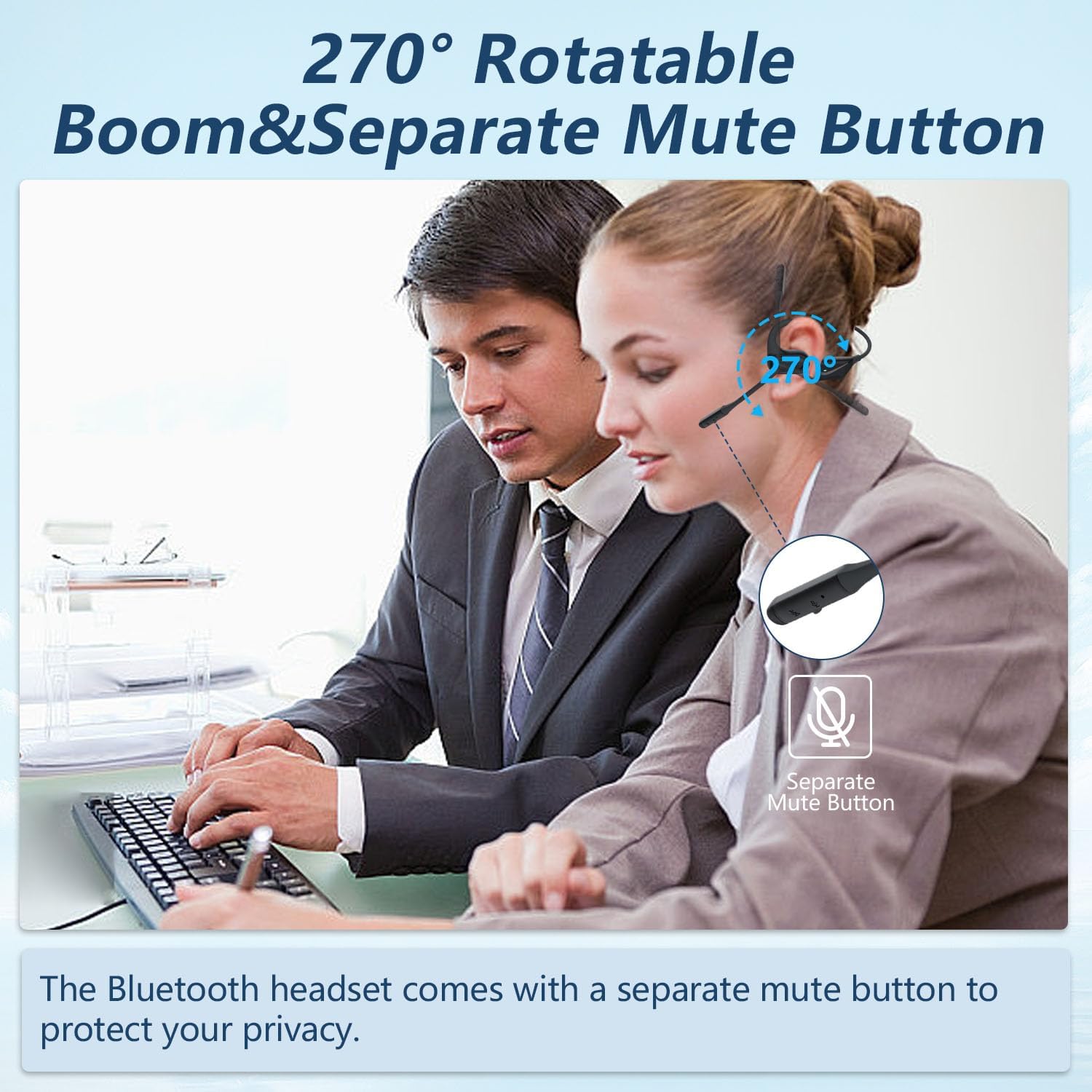 - [Noise-canceling Mic & Mute Button] Bluetooth headset with DSP and CVC.8 noise cancellation technology that filters out 95% of background noise to provide clear audio for calls and music. Bluetooth headphones flexible boom can be rotated 270Β° to adjust to the best position to better pick up your voice, ensuring that others can hear you clearly and improve call quality. In addition, open ear wireless headset with separate mute button to better protect your privacy when on a call.