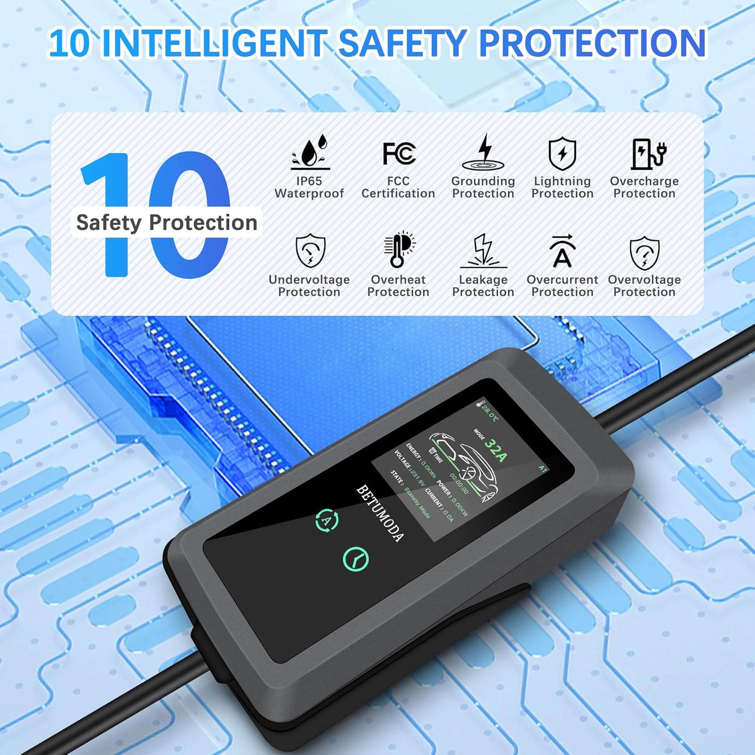 - Safety: Our charger has passed FCC certification and is equipped with built-in over-voltage, over-current, and short-circuit protection. In the event of an overload, the protection mechanism will automatically report errors and power off to ensure top-notch safety. Additionally, its IP65 waterproof design ensures durability and safety in various weather conditions.( Important Reminder: Please only use the original adapter included with this charger. Using third-party or incompatible adapters may lead to overload, short circuits, or damage to your vehicle or EV charger.)