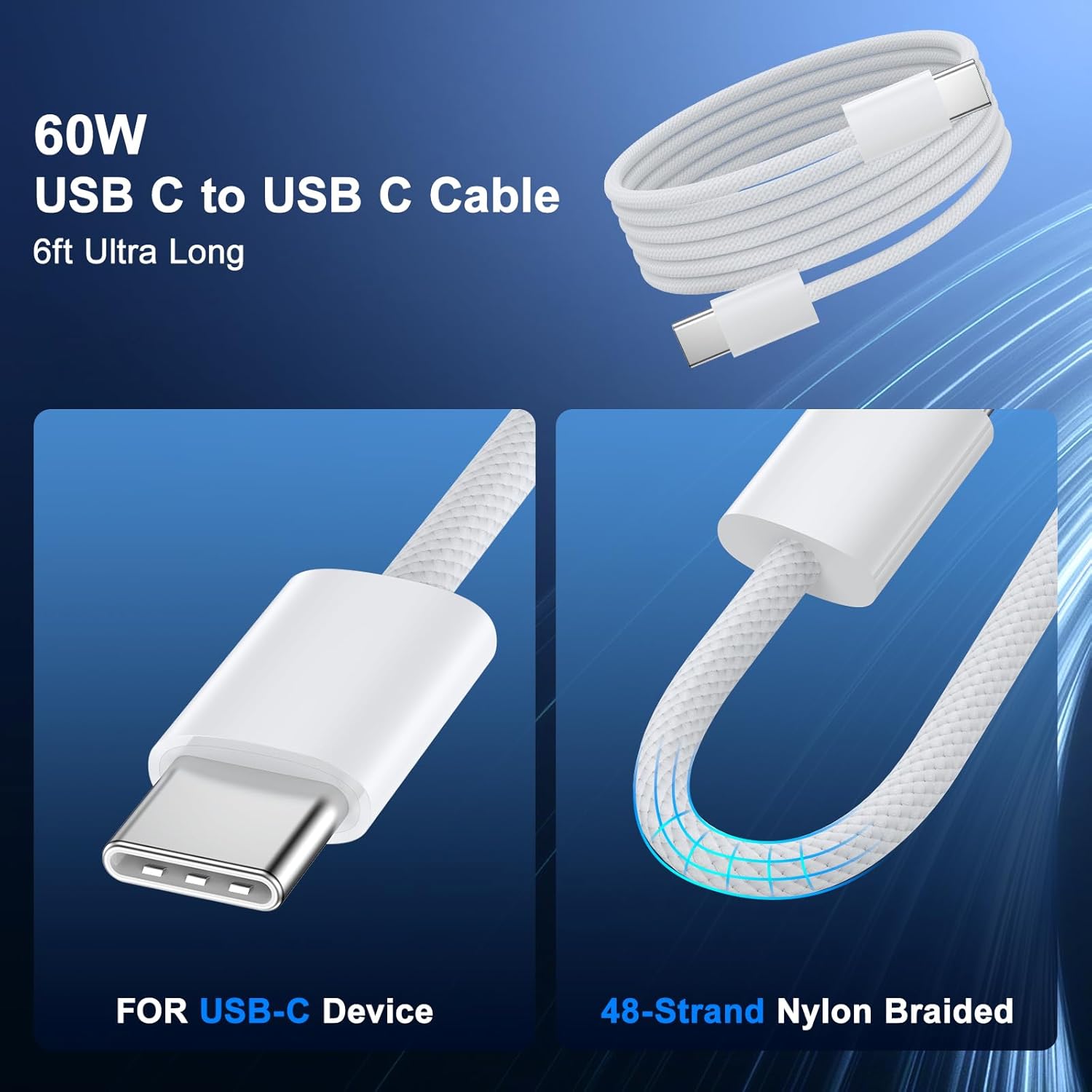 - Cable Works for iPhone 16: Package comes with 1 X 6ft USB C to C cable, which is compatible with iPhone 16 and iPhone 15 series. Compared with normal PVC/TPE material USB C cables, ours is covered by 48 strand nylon, make it stronger and tangle-free. Even though you’re sitting at the back seat you could still enjoy fast charging.