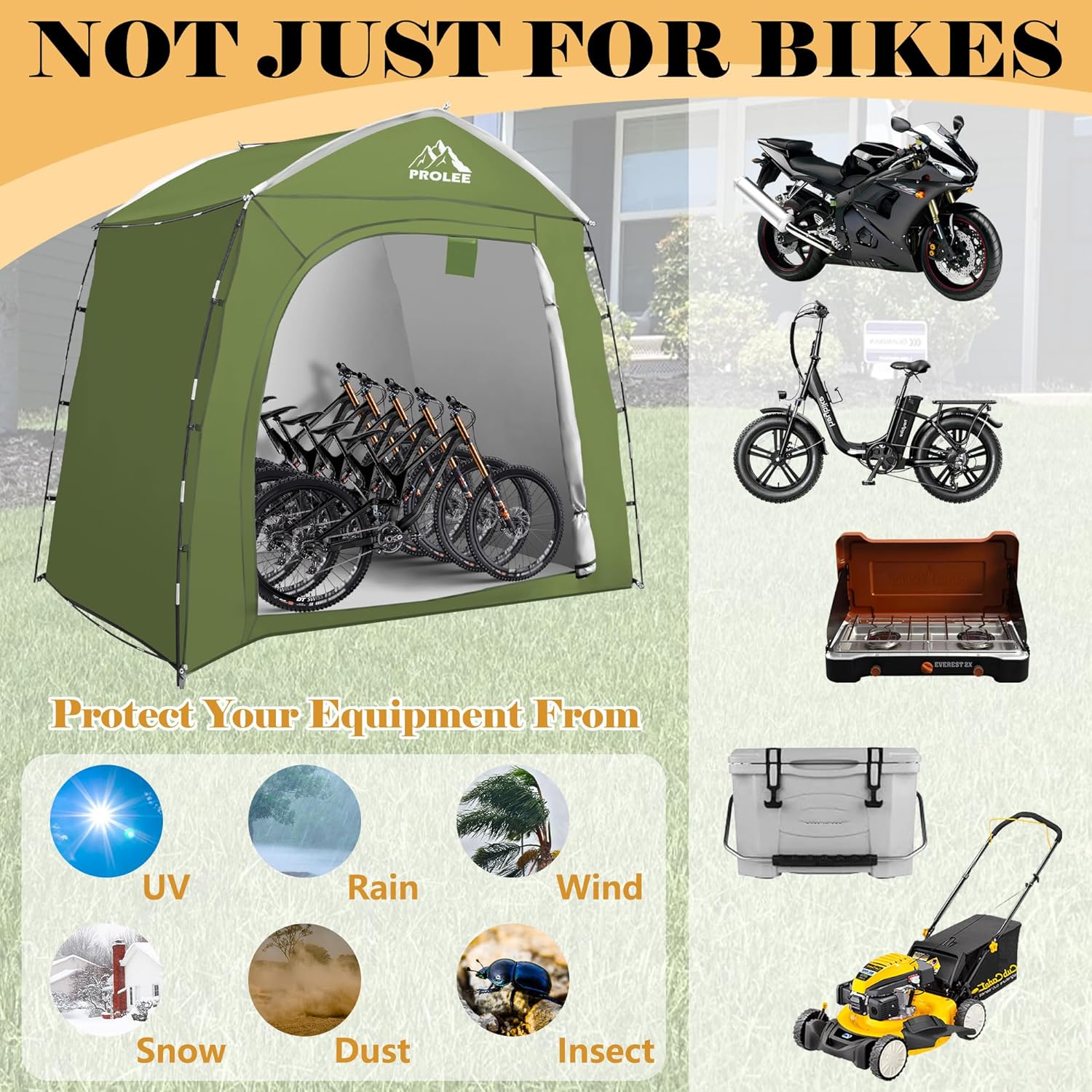 - 【Extra-Large Capacity】Measuring a generous 95"L × 61"W × 83"H, this bike shed offers ample space to accommodate up to 5 adult bikes or 1 large motorcycle with ease. It's the ideal storage solution for families and cycling enthusiasts with multiple bikes. This tent ensures your bikes remain protected from rain, snow, and harsh sunlight, providing peace of mind no matter the weather. NOTE: We give one extra main pole for bonus as a spare part, making it more durable than other products.
