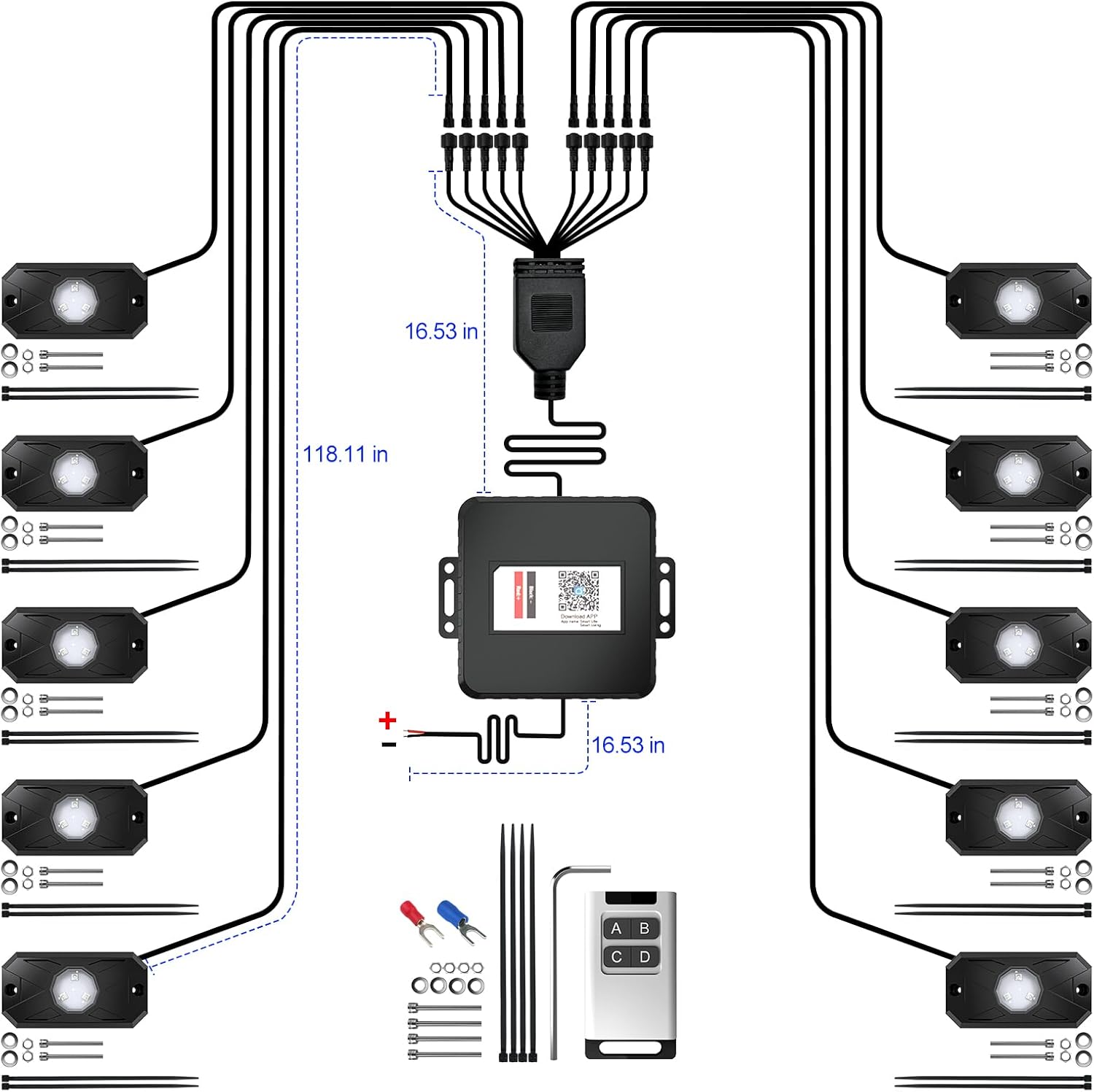 - Included Components : LED Rock Lights, Control Box, Remote, Heat Shrink Wire Connectors, Fuse Holder, Blade Fuse, Zip Ties, Screws, Allen Wrench LED Rock Lights, Control Box, Remote, Heat Shrink Wire Connectors, Fuse Holder, Blade Fuse, Zip Ties, Screws, Allen Wrench