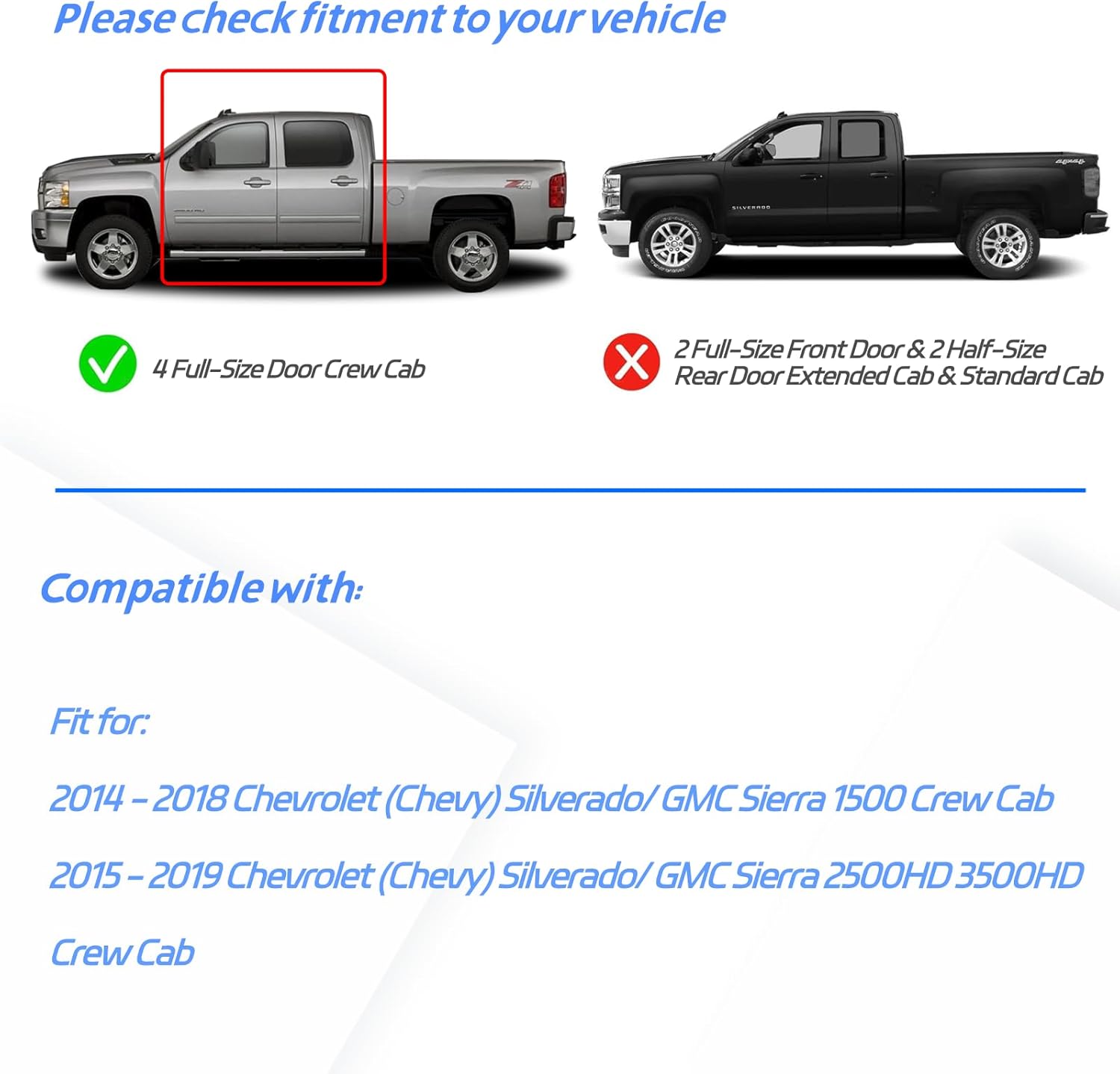 - ăVehicles Fitmentsă CUSTOM Fit for For 14-18 Chevy Silverado 1500 Crew Cab; 15-19 Chevy Silverado 2500 3500 Crew Cab; 14-18 GMC Sierra 1500 Crew Cab; 15-19 GMC Sierra 2500 3500 Crew Cab (ONLY For 4 FULL-SIZE Doors)