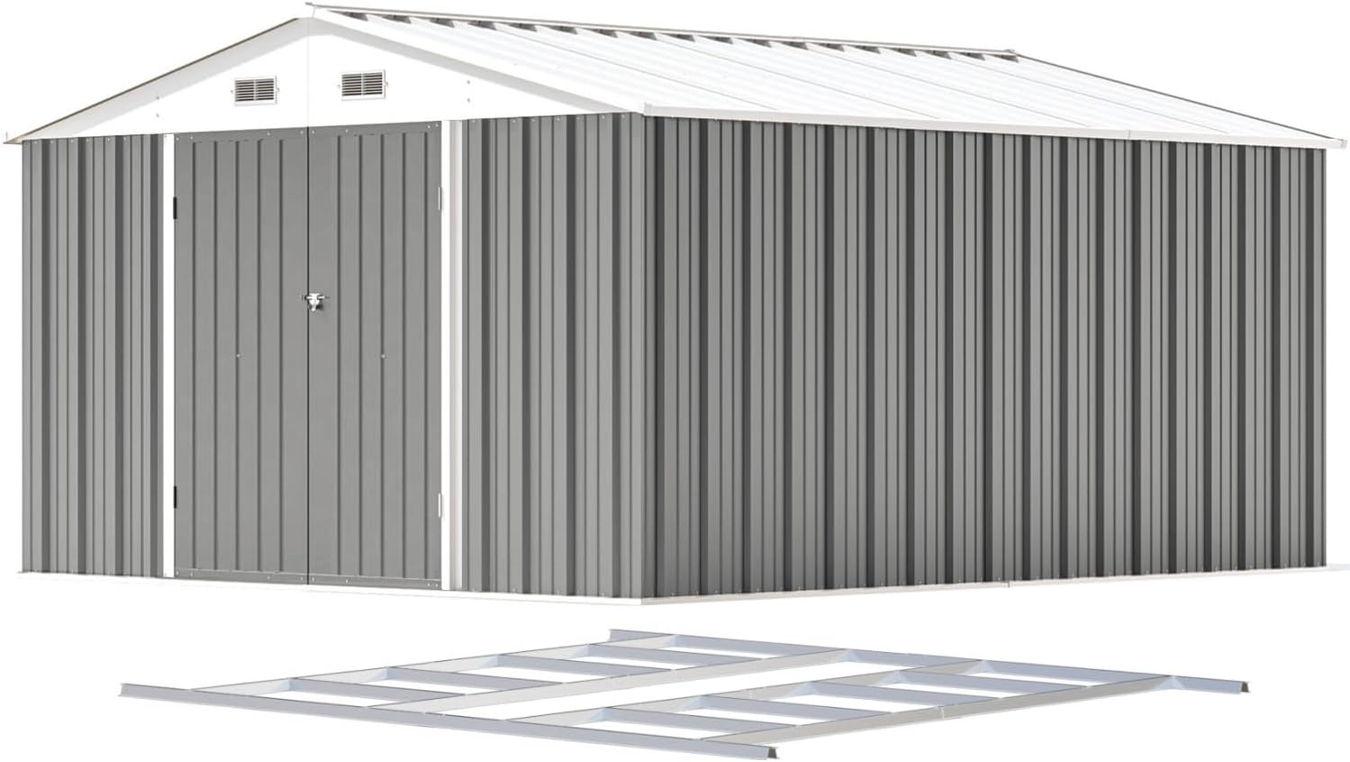 Patiowell 10 x 12 FT Metal Storage Shed for Outdoor with Floor Frame, Steel Yard Shed with Design of Lockable Doors, Utility and Tool Storage for Garden, Backyard, Patio, Outside use, Grey