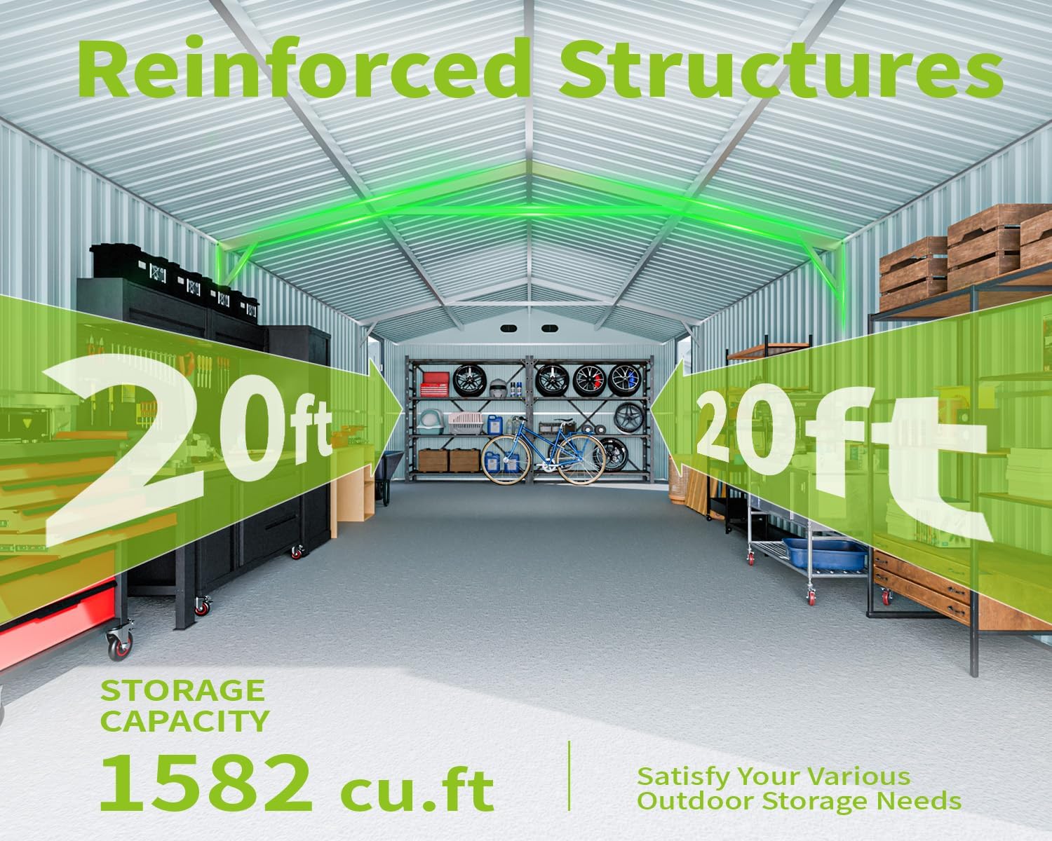 • ๐Ÿก ๐„๐ฑ๐ฉ๐š๐ง๐ฌ๐ข๐ฏ๐ž ๐’๐ญ๐จ๐ซ๐š๐ ๐ž ๐’๐ก๐ž๐: Discover our 20x13 ft large metal storage shed, which provides 250 sq. ft. of usable floor space. Ideal for storing vehicles, tools, lawn equipment, and bicycles. This shed offers versatility as it can also be a workshop or a play area for kids, helping you to organize your outdoor space and reduce clutter in your backyard, basement, or garage.