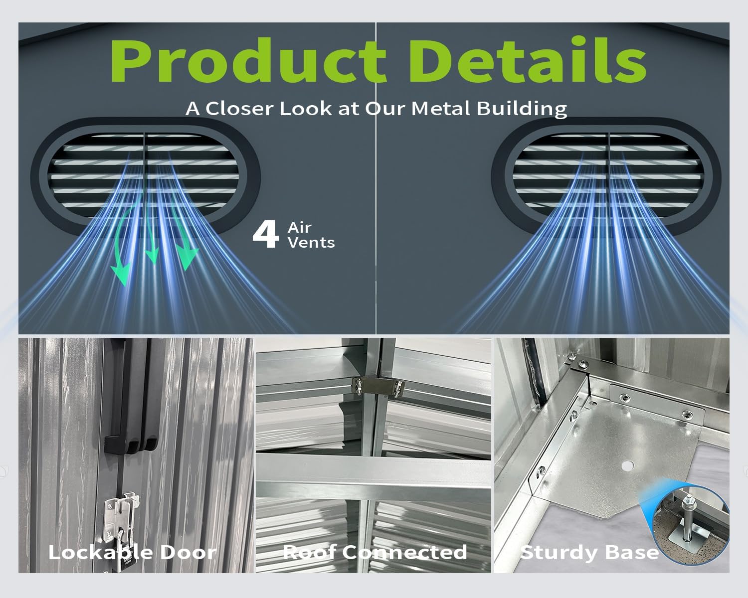 • ๐Ÿก ๐–๐ž๐š๐ญ๐ก๐ž๐ซ-๐‘๐ž๐ฌ๐ข๐ฌ๐ญ๐š๐ง๐ญ ๐Œ๐ž๐ญ๐š๐ฅ ๐’๐ก๐ž๐: This expansive outdoor storage shed is built to be waterproof with a sloped roof that efficiently prevents water leakage or accumulation from intense rain or snow. It has four vents to improve air circulation, preserving the condition of your tools. The shedโ€™s sloping roof and lockable door help to eliminate odors and lessen moisture, and it includes a lock for concealed storage.