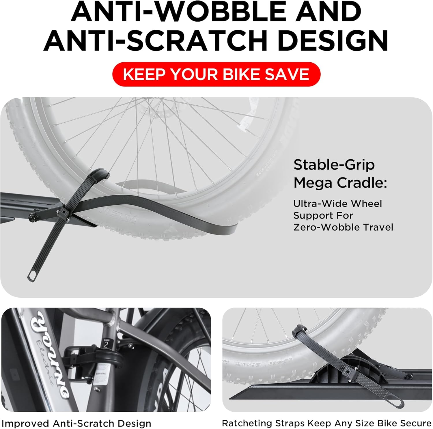 - SAFE AND SECURE ON OFFROAD: Comes with 2-arm fix, Anti-falloff 360Β° swirl structure and anti-wobble structure, that secure your E-bikes in place without swaying and knocking against vehicle.