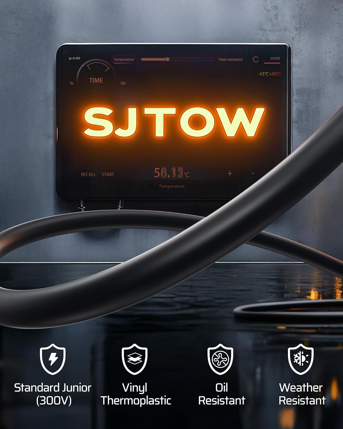 - [SJTOW Cord] Made of special PVC material, the extension conrd winder resists tangling and UV rays, ozone, water, and acids commonly found in garages; also oil- and stain-resistant, with excellent weatherproofing and flexibility even in low temperatures
