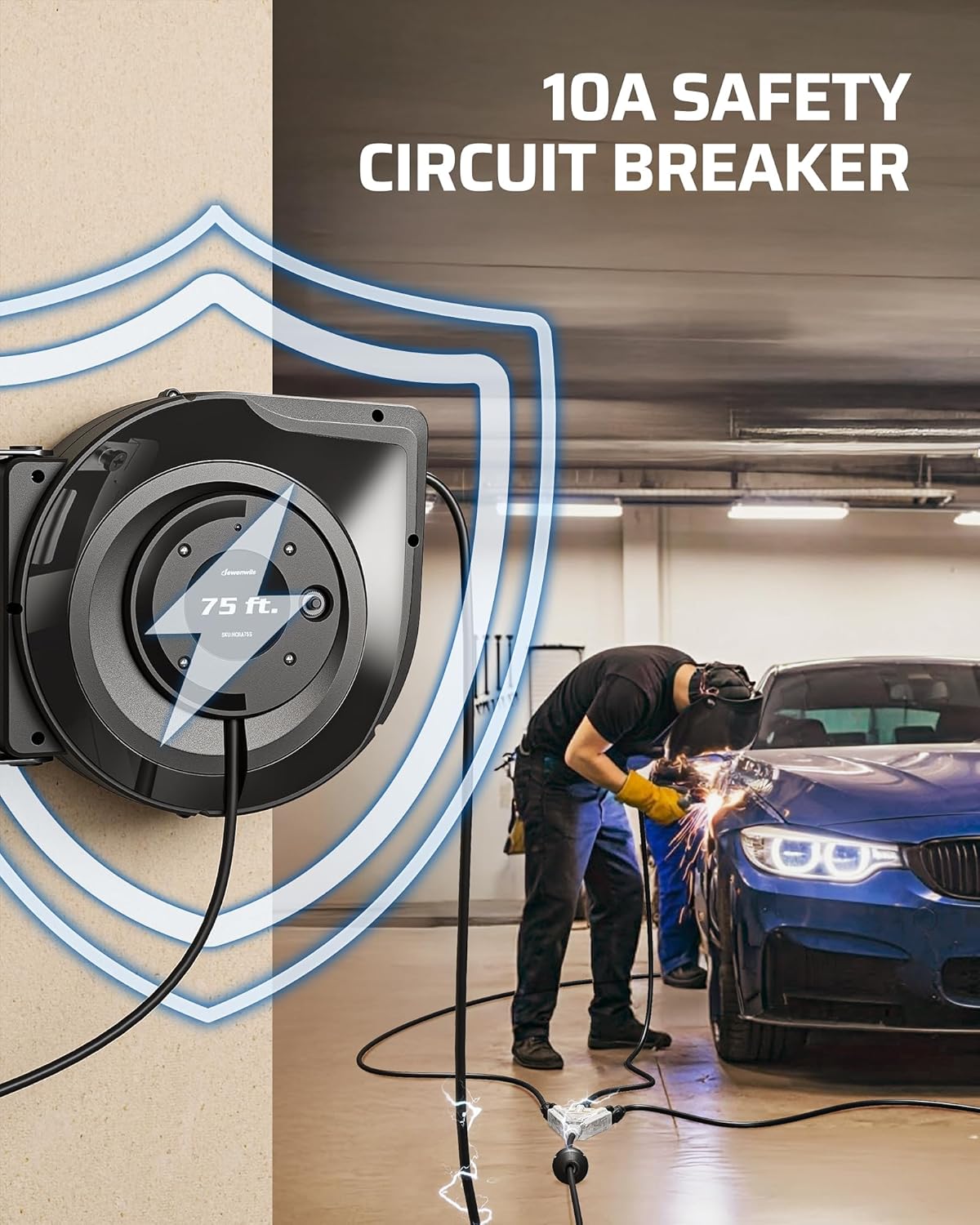 DEWENWILS 75FT Extension Cord Reel, 14/3C SJTOW Retractable Extension Cord Reel, Lighted Triple Outlets, 10A Circuit Breaker, Heavy Duty Power Cord, UL Listed, Ceiling/Wall Mount