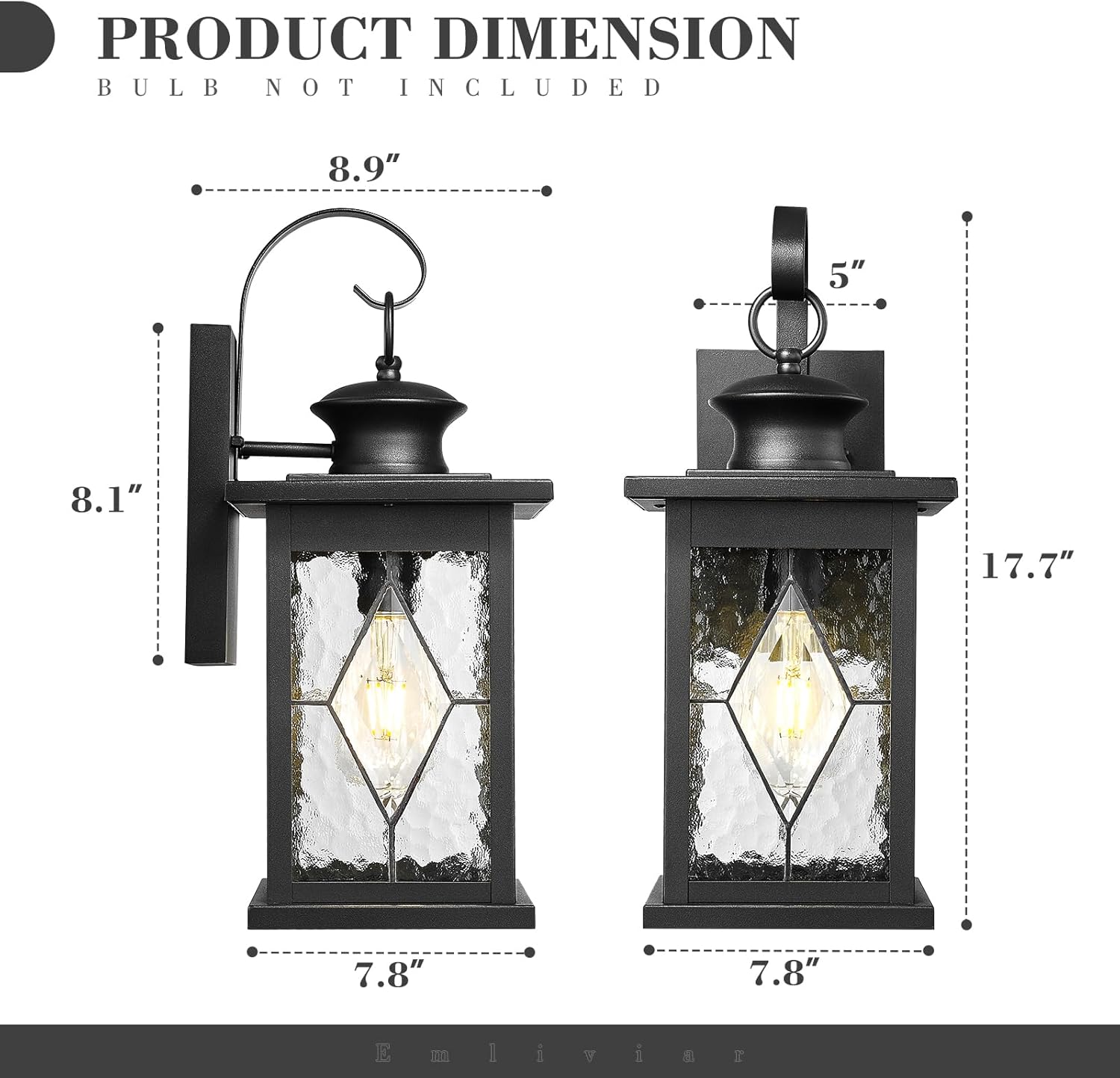 - Weather-resistant and rust-resistant, this patio wall lamp sturdy metal and aluminum construction with water grain glass, suitable for wet locations. The black finish suits any house decoration.