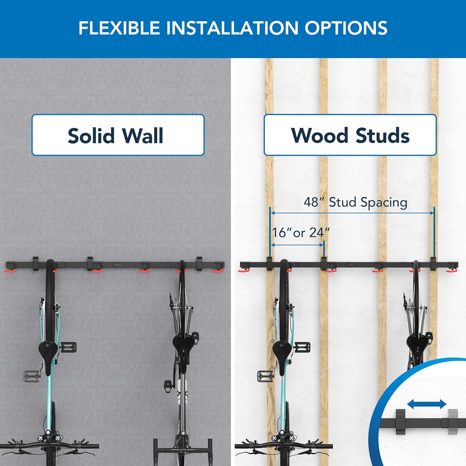 • PROTECTIVE RUBBER-COATED HOOKS – Soft-padded hooks prevent scratches and damage to your bike frames, keeping them in excellent condition while stored on the rack. EASY INSTALLATION ON SOLID WALLS – Designed for wood studs and solid walls, this wall mount bike rack includes all necessary hardware, making setup quick and simple for any garage or shed.