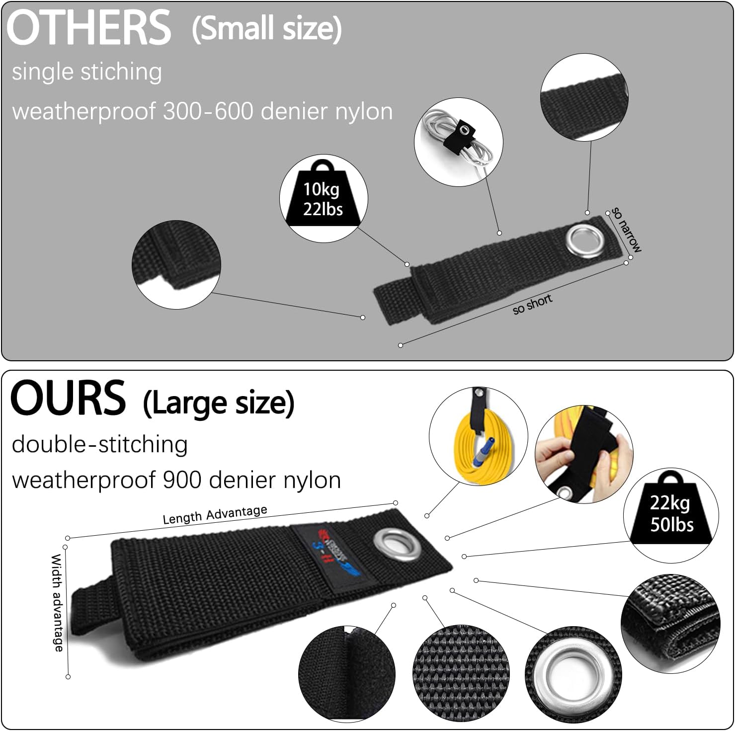 - Upgrade steel material and backboard: Our extra large square garden hose hook upgraded the backboard and added additional support points, which solves the problem of traditional hose hook where the backboard and steel material tend to separate at the welding points under long-term heavy loads. The heavy duty hose mount is made of construction-grade 8mm steel bars, so that our garage organizer can hang 10kg more weight than traditional hooks