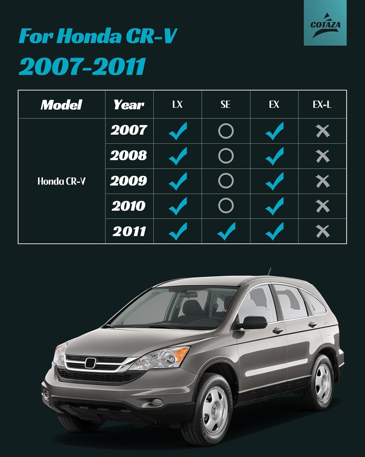 - Custom Fit Floor Mats for Honda CRV 2007-2011: precision-mapped contours for floor protection. These car floor mats are meticulously tested and verified on actual 2007-2011 LX, EX, SE models, which provide a custom, integrated layer of defense that fits like a glove. Note: Our custom fit floor mats are only for cars without under seat subwoofer, Not for EX-L with under seat subwoofer