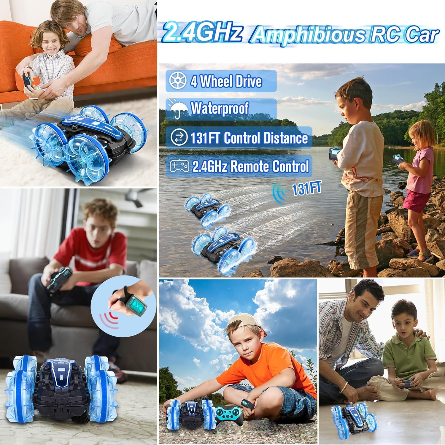 - 2025 Newest Amphibious Remote Control Car: The amphibious rc car can drive on land or surf on water! Not only the whole body of the amphibious rc car, but both the hand remote controller and watch remote controller are upgraded, which make sure that the rc car and remote controller can be completely immerse in water and played normally. The rc car can do what all the common stunt cars do and what they can’t and it can bring children endless fun, whether on land or in water