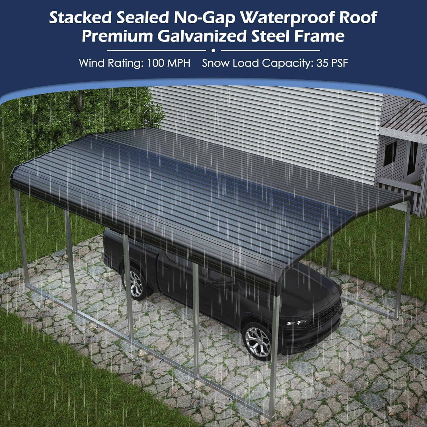 - 【All-Weather Protection】Constructed with heavy-duty alloy steel, the carport boasts galvanized frame and waterproof roof, shield your vehicle from harsh weather conditions such as scorching sun, hail and snowstorms. It is spacious enough to accommodate cars, trucks, tractors or boats, and serves as a carport canopy as well as a shelter for outdoor activities. Wind Rating: 100 MPH; Snow Load Capacity: 35 PSF