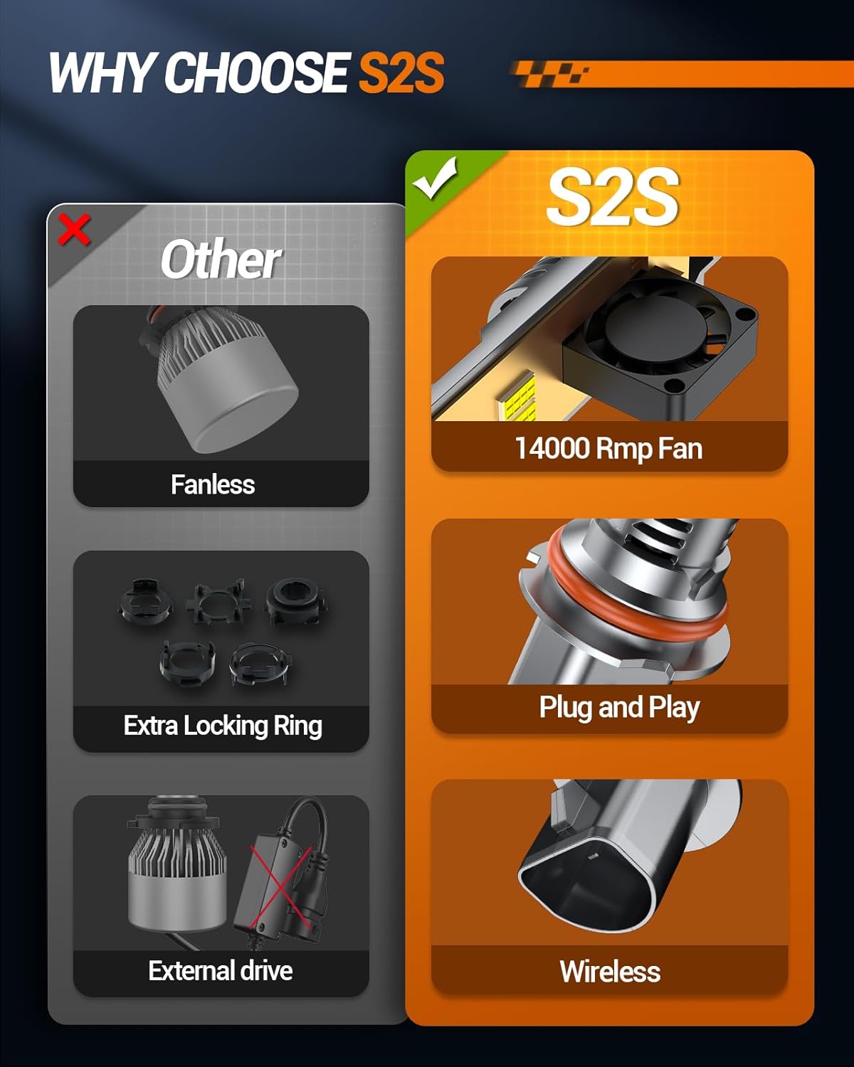 - Wide View And Safer: The S2S 9004/HB1 fog bulb is equipped with advanced smart IC drives with radiating distances of 1600F, 50000 lumens and 6500K cool white, ensuring a clearly visible driving experience at night. Made of high-speed cooling fans and single copper tubes, our bulbs keep low operating temperatures and provide reliable performance at night for longer life of over 60,000 hours.