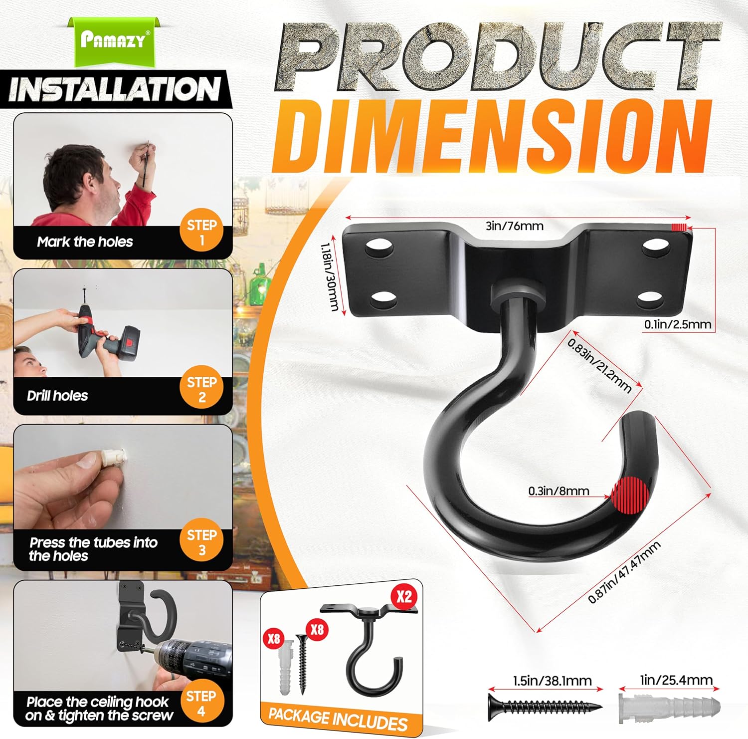 - [Easy To Install & Use] These ceiling hooks are simple to install; just drill holes in the wall, install expansion screws, and tighten the screws after installing the hooks. It can be assembled on the ceiling, brick, wood, and concrete walls, providing a perfect solution for hanging a range of items, including bird feeders, lanterns, plants, or decorations, making it a versatile accessory for any outdoor space. PACKAGE INCLUDES: 2 Ceiling hooks, 8 screws, and 8 expansion tubes.