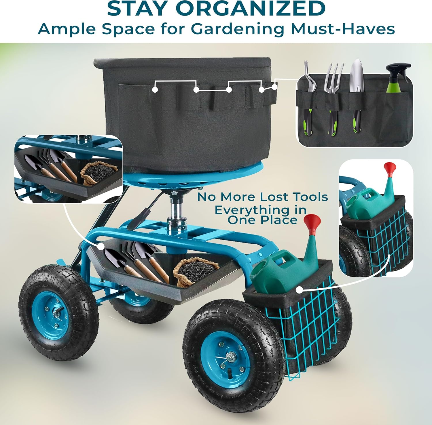 Garden Seat with Wheels – Adjustable 360° Swivel Gardening Stool with Hydraulic Height Adjustment, Ergonomic Backrest, and Tool Storage – Rolling Stool for Garden, Yard, and Outdoor Use