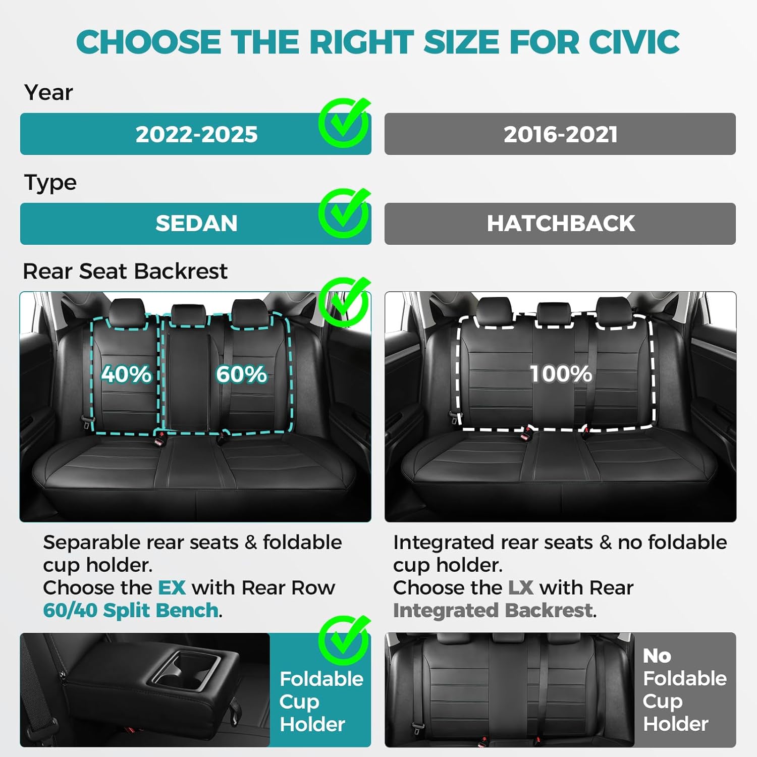 - Tailored for Civic - Designed exclusively for civic, ensuring a perfect fit like a glove.Say goodbye to ill-fitting, sliding universal covers with limited coverage.Please note that these size only fit for the 2022-2025 Civic EX. Ensure that your back row has three seats that are split 40/60 and equipped with foldable cup holder armrests