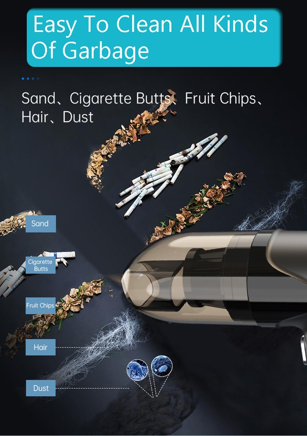 - ๐จ[Powerful Suction with Strong Motor] Built in high-speed motor, the small car vacuum portable cordless offers 11000pa suction in max mode, which can clean dust, crumbs and other large debris in seconds, either at home, office or in the car. With its powerful suction, efficient cleaning capability and portability, this vacuum cleaner is ideal for everyday home use and portable cleaning needs.