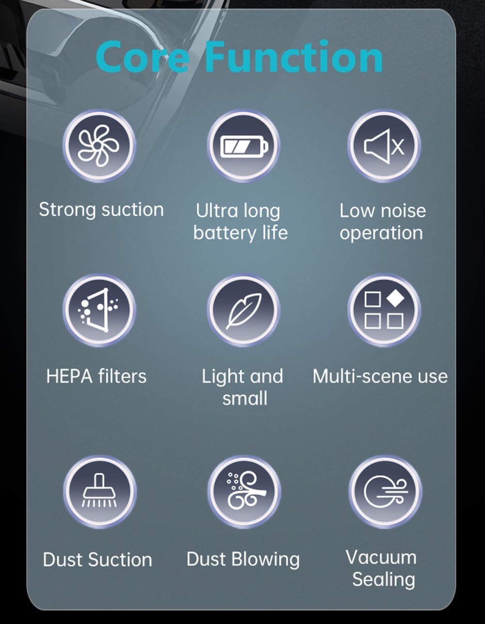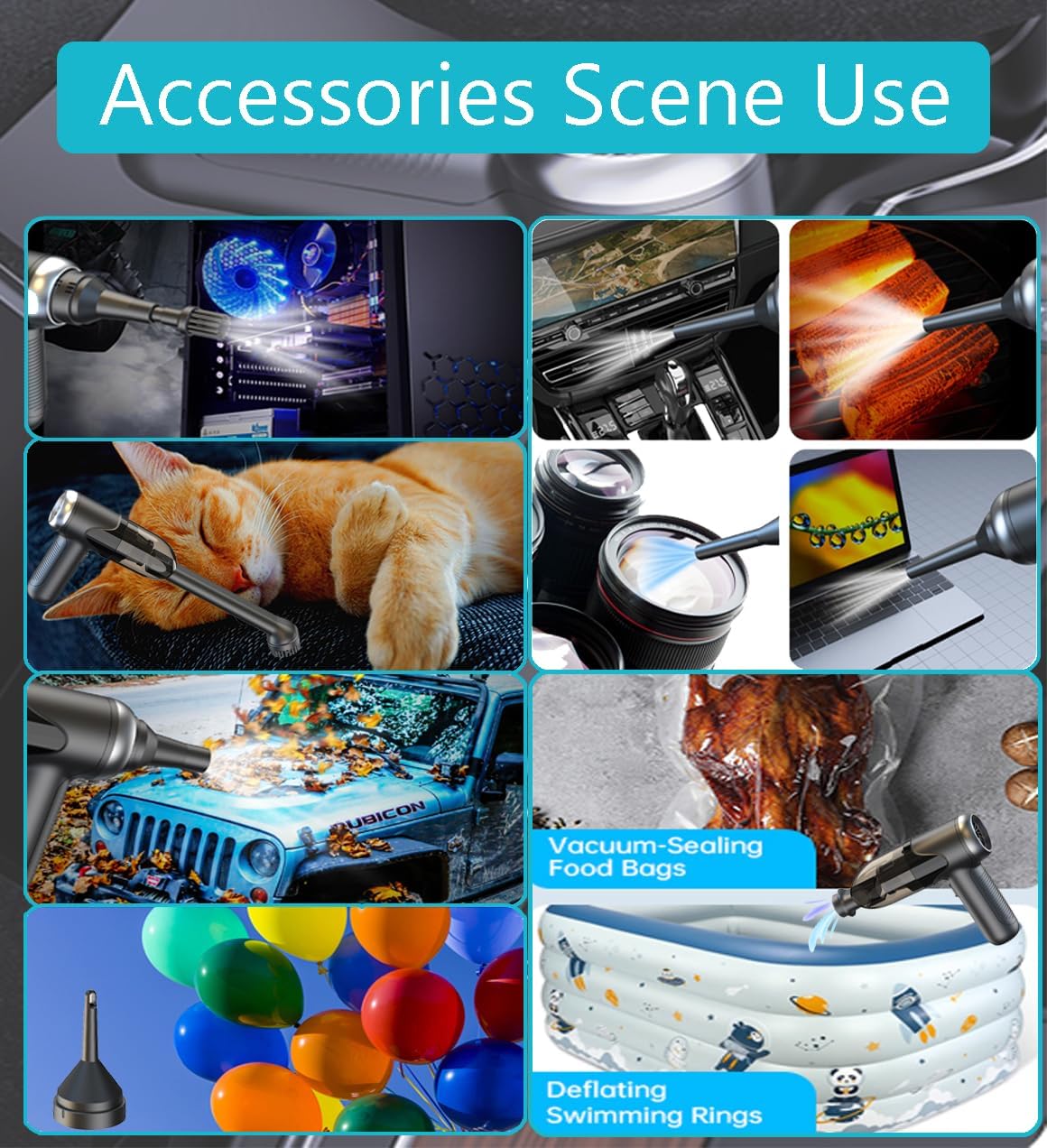 - ๐จ[3-IN-1 VACUUM CLEANER] This handheld vacuum cordless comes with 7 detachable accessories for blowing, vacuuming, and inflating, meeting all your daily cleaning needs. Its powerful suction effortlessly removes dust and debris from car seats, carpets, and crevices. The other end functions as a blower, easily clearing dust from keyboards, camera lenses, and windows, it can also inflate balloons and swim rings.