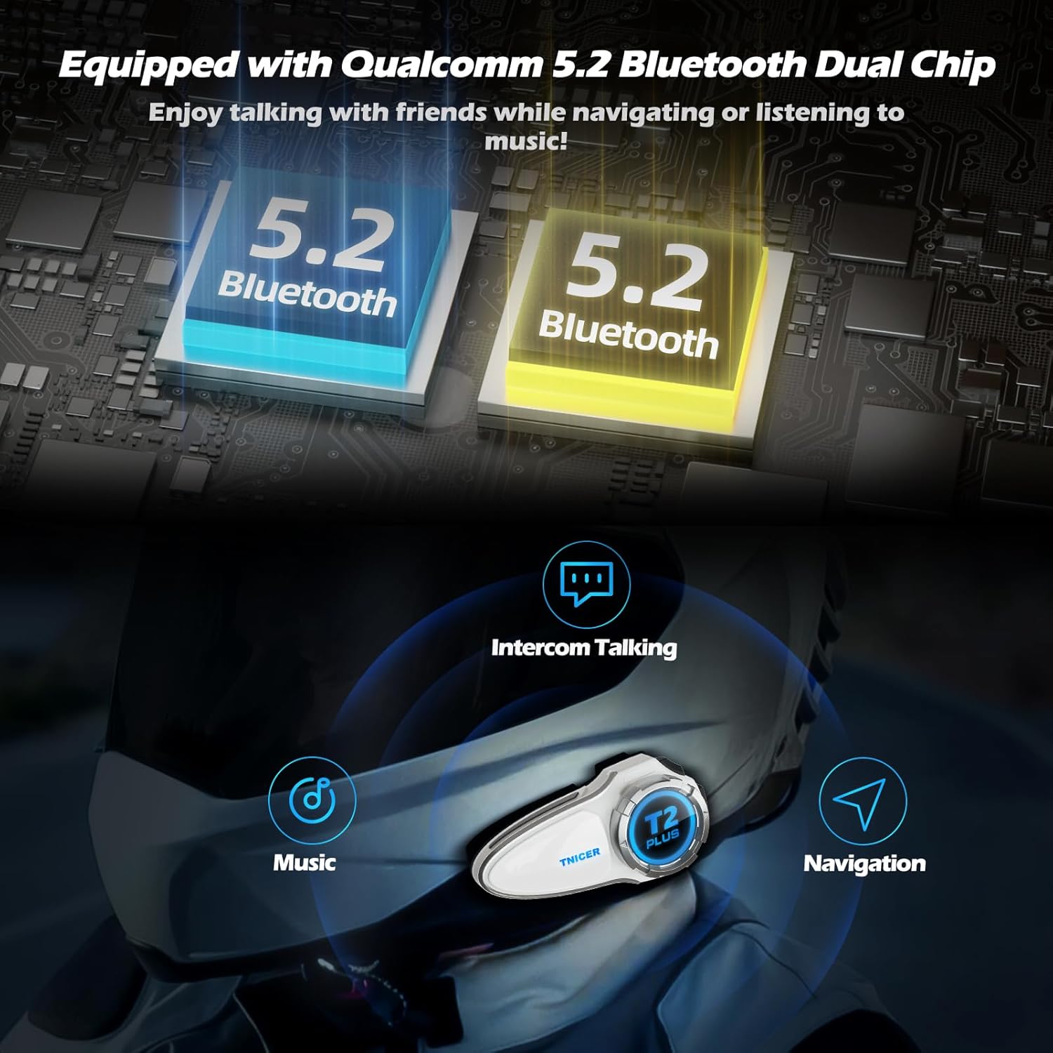 - 【Equipped with Excellent Bluetooth 5.2 Dual Chip】The T2Plus motorcycle intercom allows you to have intercom conversations while listening to music or navigating. Up to 8 riders can communicate in real-time within a range of 1500 meters, making communication with your companions much smoother. In pairing mode, you can connect all T2Plus devices with just one button press, freeing you from complicated setup processes.