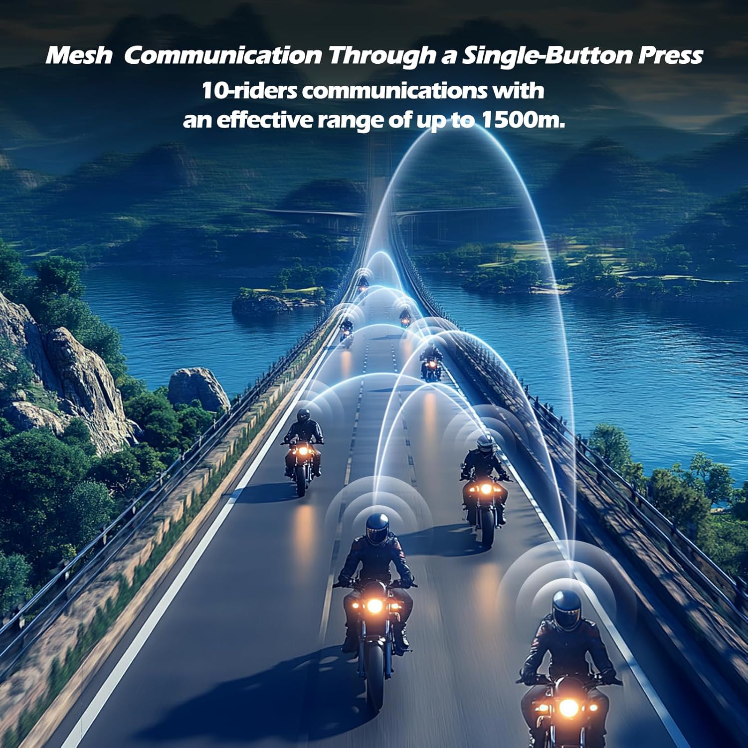 - 【Equipped with Mesh 3.0 Mesh Communication】The MESH communication feature of the T2Plus motorcycle intercom has the groundbreaking ability for up to 10 riders to communicate simultaneously. In mesh communication mode, even if riders change formation or encounter obstacles that disrupt communication, other T2Plus devices in the team can quickly form a new communication architecture and transmit signals rapidly and accurately without being affected. This allows all riders in the team to cooperate safely and keeps the connections among all team members strong and intact.