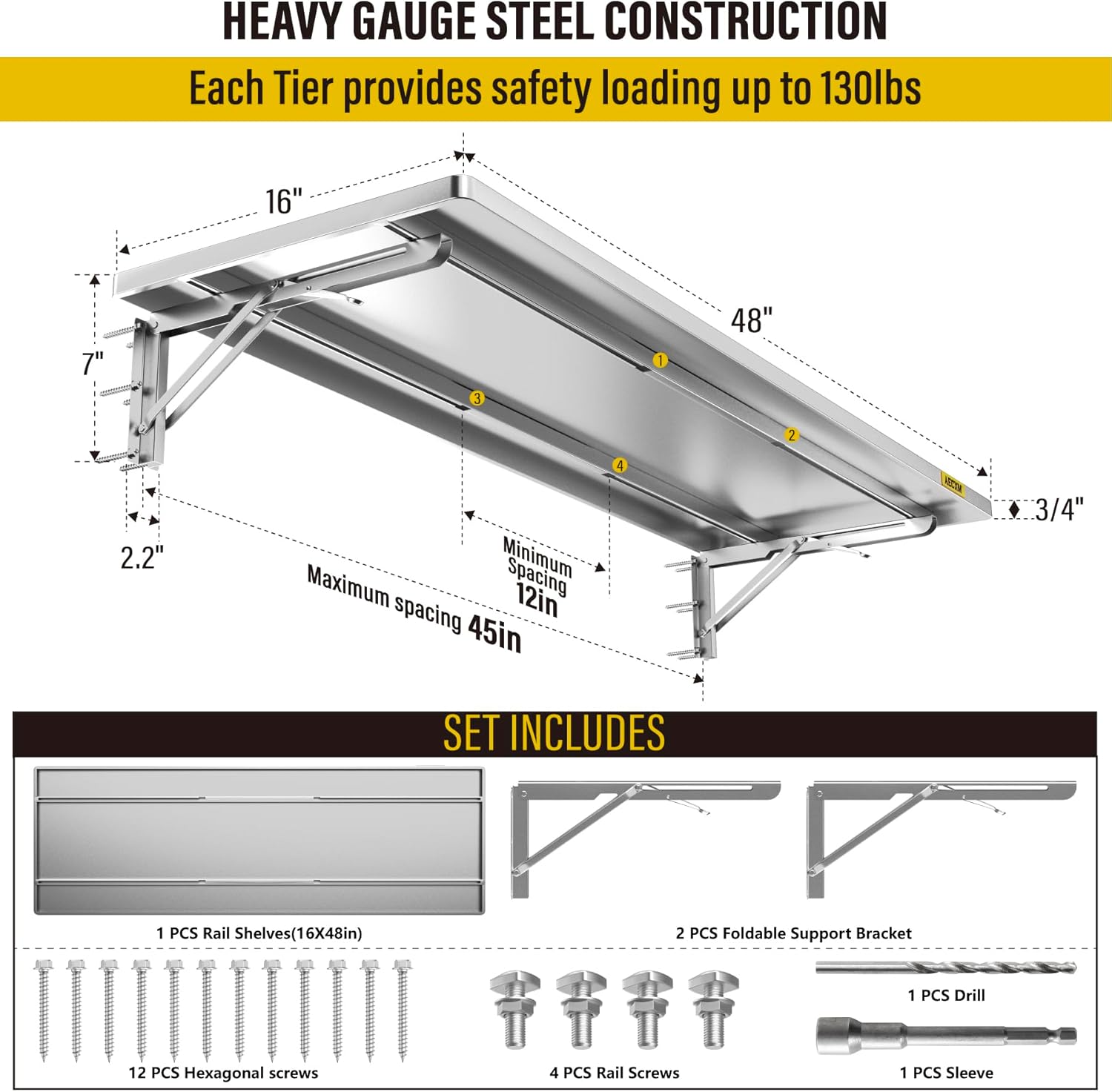 - SUPERIOR DESIGN: The foldable garage storage shelf panel is made of whole steel plate, The surface of matte high temperature powder baking paint, Flat and smooth, Panel with sliding rail design, The bracket can be installed freely in the range of 12"-45" spacing of wood wall keel, And at the same time it adopts folding bracket, Which can be freely stowed away or unfolded