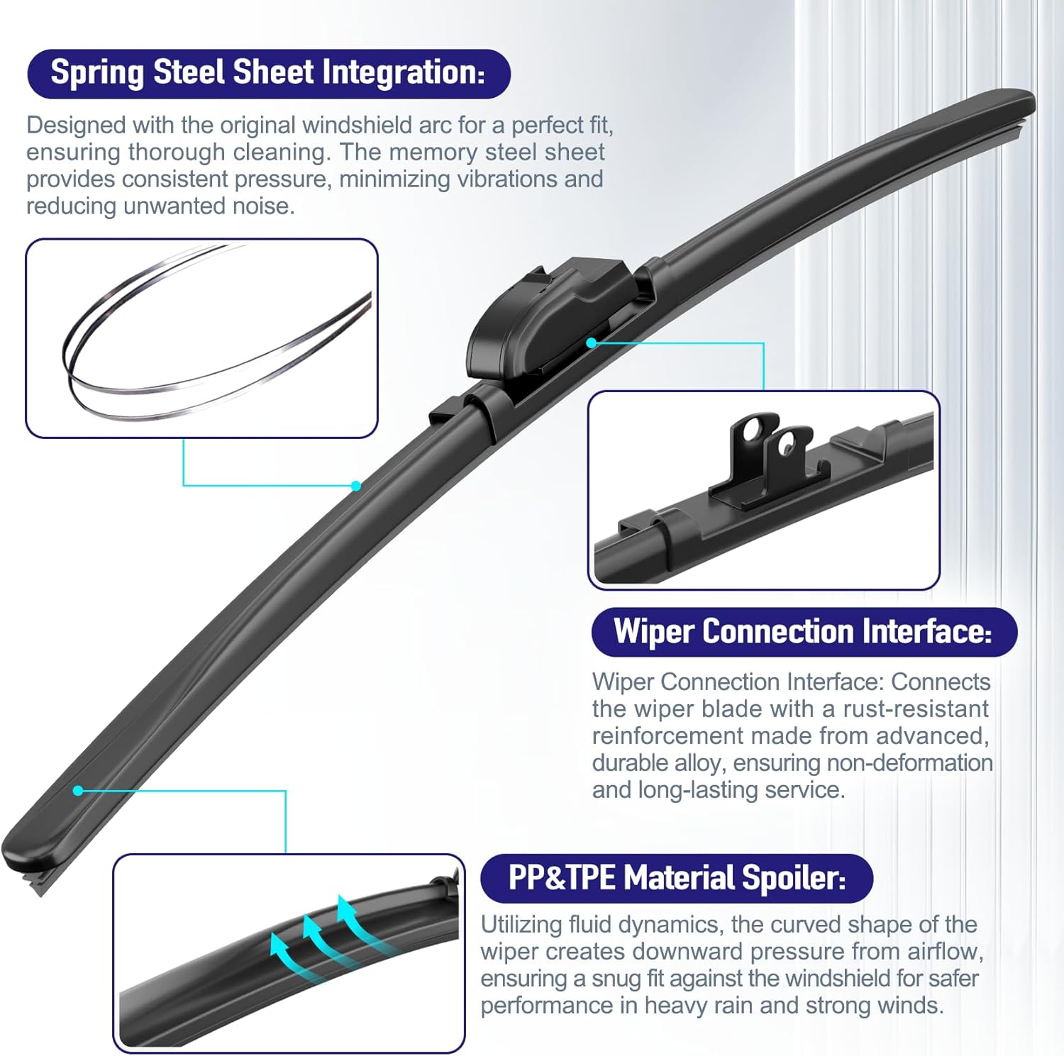 - Improved Security: Premium wind shield wipers are made with high quality materials and have a specific beam curvature, ensuring a perfect fit and performance. silicone wiper blades utilize dual precision-tuned steel springs to apply uniform pressure along the entire blade length, resulting in crystal clear visibility in all weather conditions