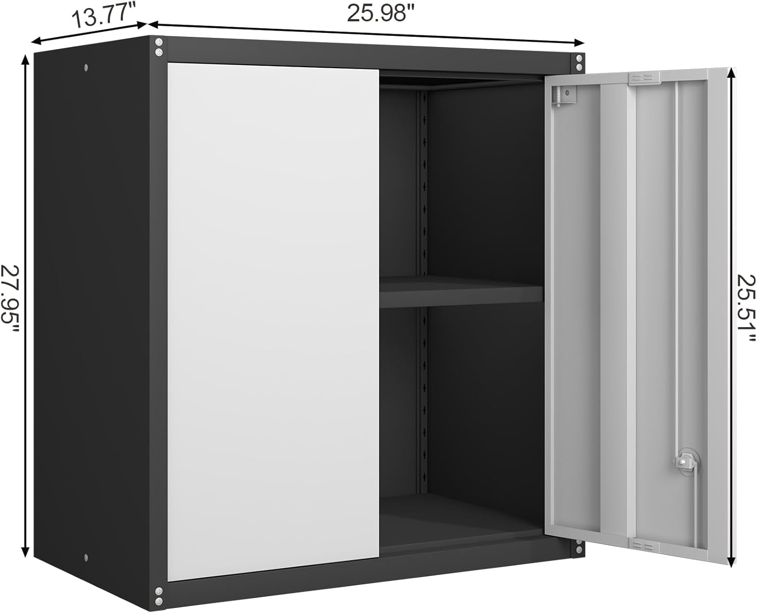 - ăWall Mounted CabinetăThis wall mounted storage cabinet has a size of H28"*W26"*D13.8". The compact size and adjustable shelf of this steel cabinet let you maximize your space and create more storage solutions with creativity