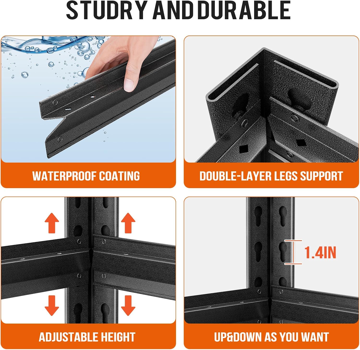- ă3000LBS Garage Storage Shelves Heavy Dutyă:Thickened metal shelving are made of quality metal material, covered with rust-proof powder coating, anti-scratch, rust-resistant, durable and easy to clean. Each level has sturdy support rib and can hold up to 600lbs. Garage shelf's total max load weight is 3000lbs. Double thickened metal legs are designed to provide excellent support. This rack shelf is more stable and sturdy than regular metal shelf for long-term use