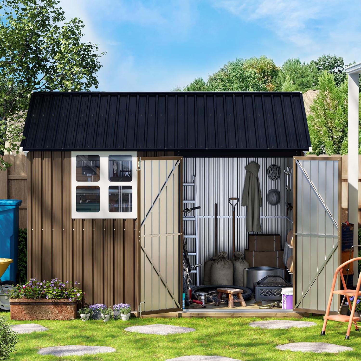 10X8FT Outdoor Steel Storage Shed with Lockable Doors, One Big Window,Ideal for Garden, Backyard, Patio Storage,Brown