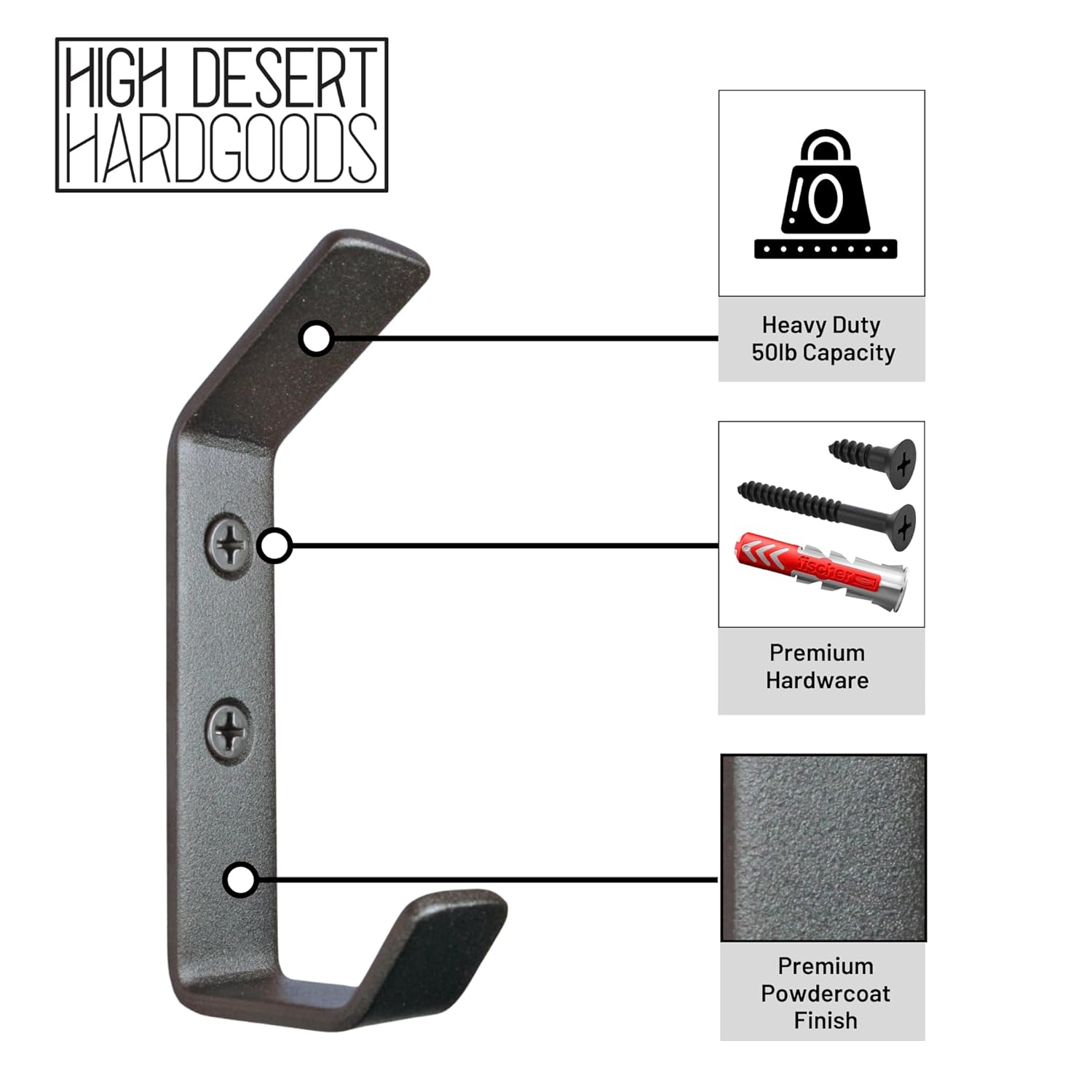 Wall Hooks Double Hook 4-Pack - Made in USA - 50 lb Capacity Stel Coat Hooks, Powder Coated Metal Wall Mount Hooks for Entryway, Garage, Bathroom.