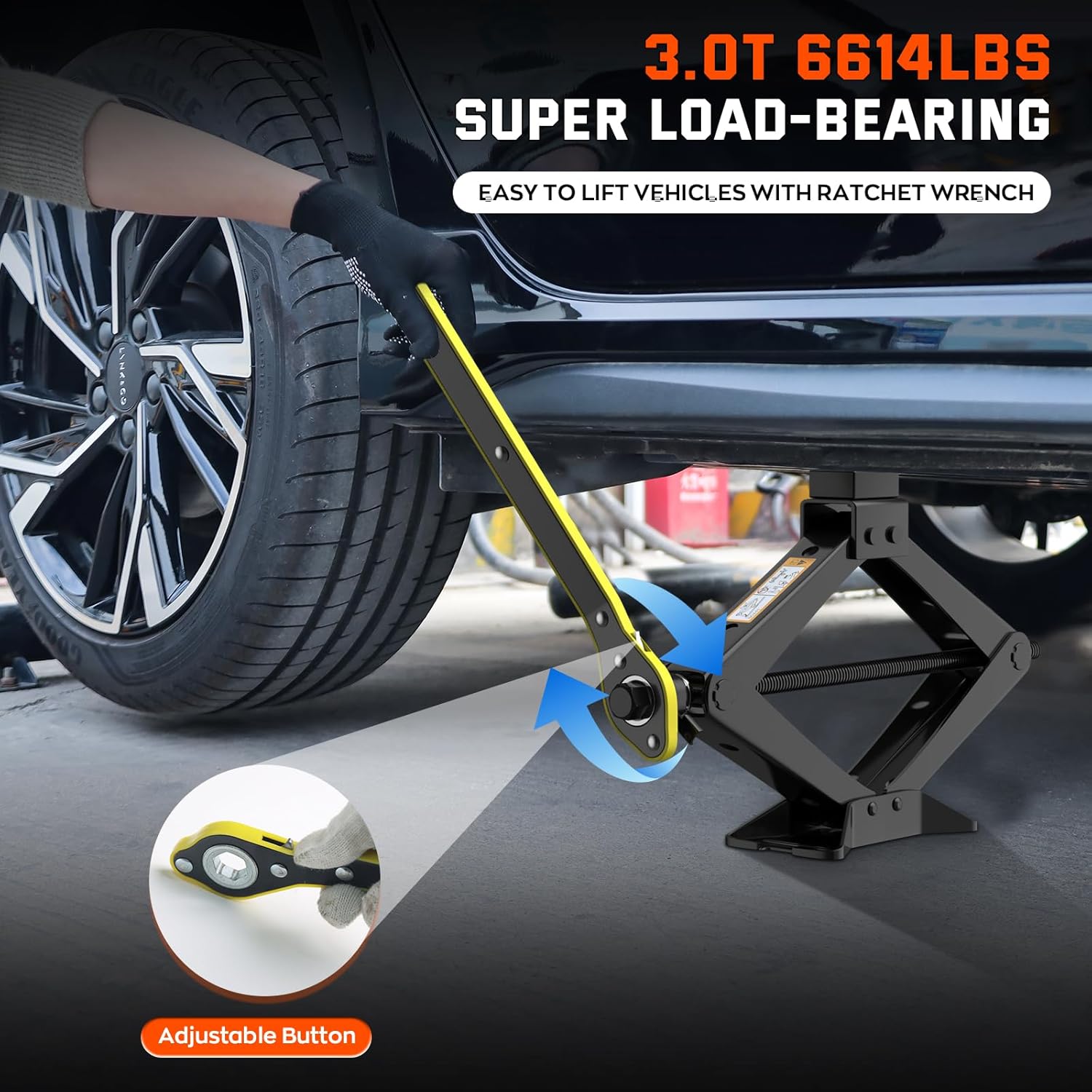 - 👍【Tire Jack Capacity】Maximum lifting weight 3 Ton (6614 lbs),This Jack for Car Lifting Range from 3.74" (9.5cm) to 16.14"(41cm). The scissor lift jack provides a wider range to reach under low chassis sedans or elevate high-body SUVs effortlessly.